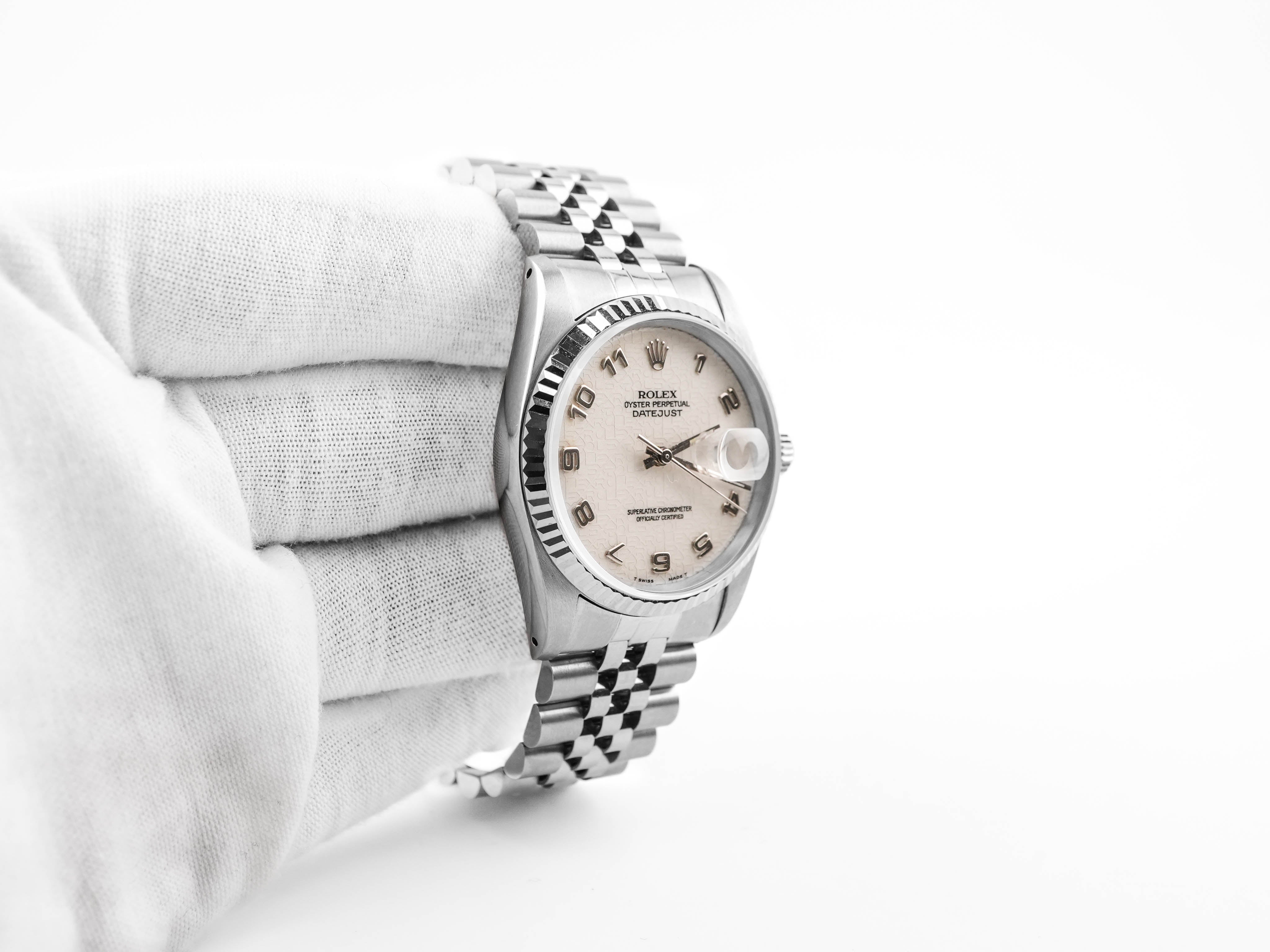 Rolex 16234 Datejust 36 mm Fluted Bezel Jubilee White Dial Jubilee Bracelet Box and Papers 1991