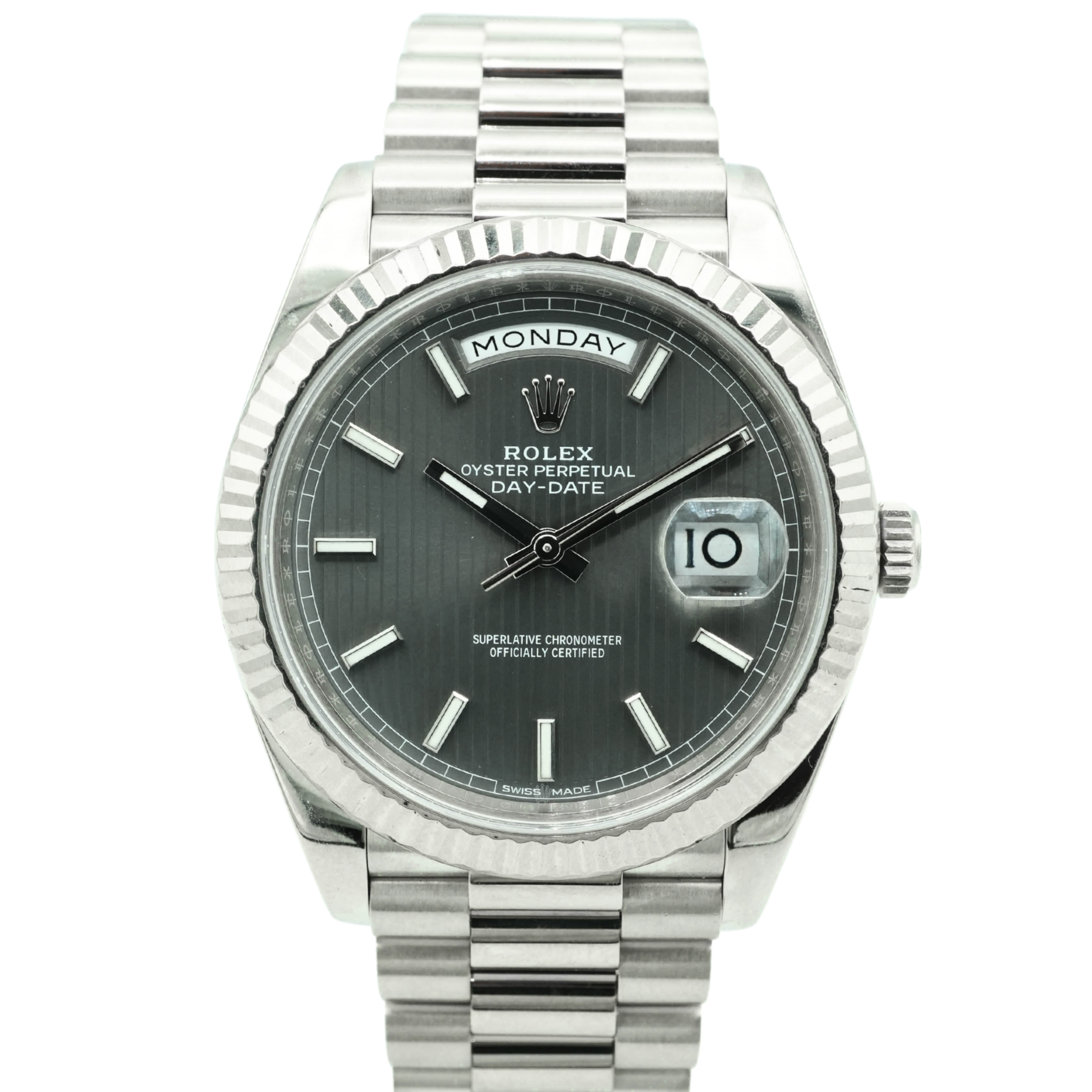 Rolex 228239 Day-Date 40 mm Dark Rhodium Stripe Motif Index Dial Box and Papers 2016