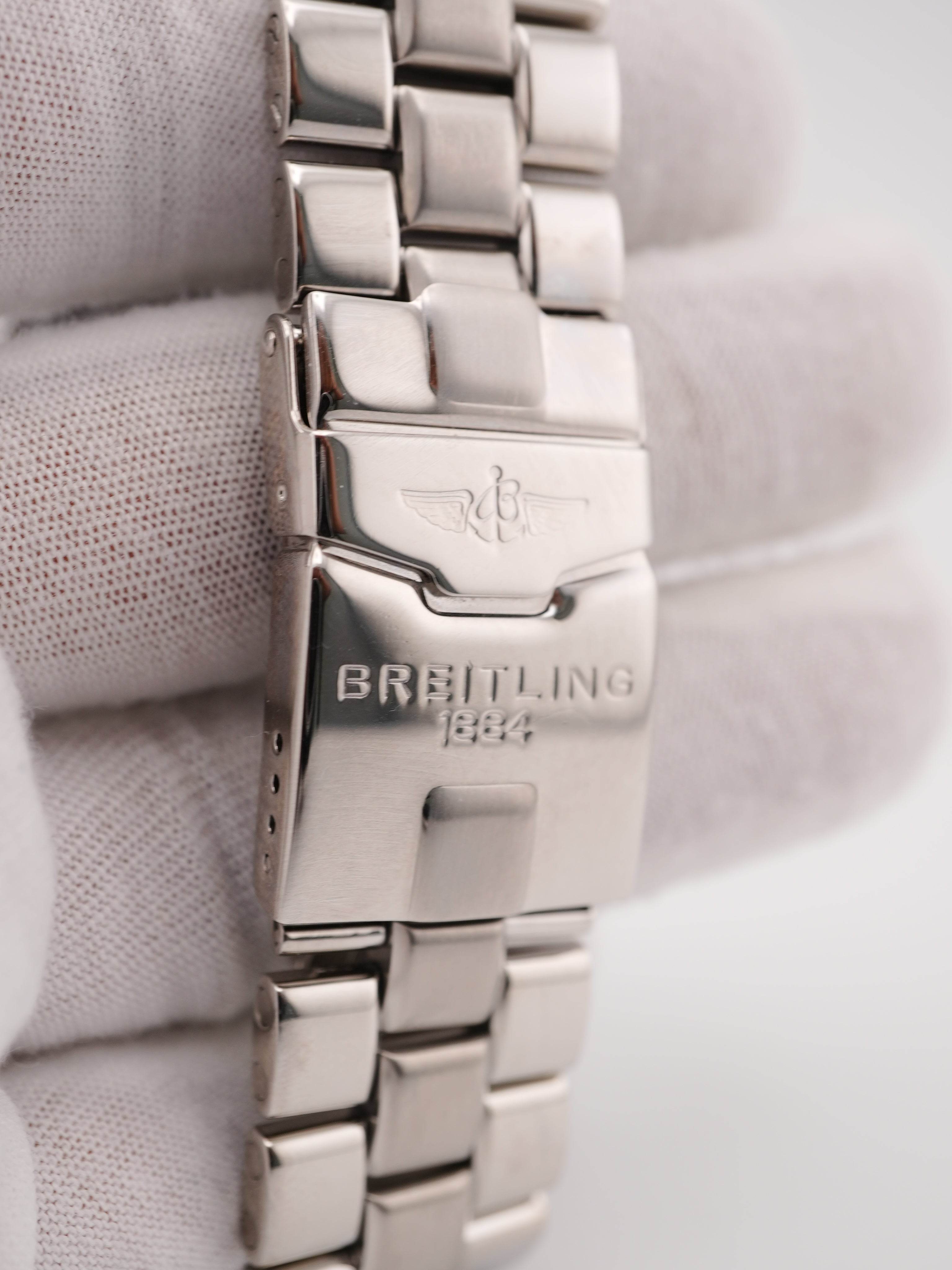 The Breitling Super Avenger Chronograph features a 48mm stainless steel case, custom diamond bezel, grey mother of pearl dial with diamond hour markers, chronograph functions, and a stainless steel bracelet.