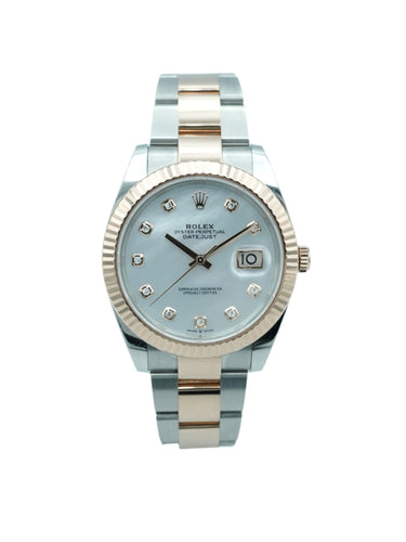 The 2016 Rolex Datejust 41 mm ref. 126331 features a mother-of-pearl dial with factory-set diamonds, fluted 18K rose gold bezel, and a two-tone Oyster bracelet. This complete set is 100 % authentic and expert verified, includes the original Rolex box and papers, and ships with free insured shipping.