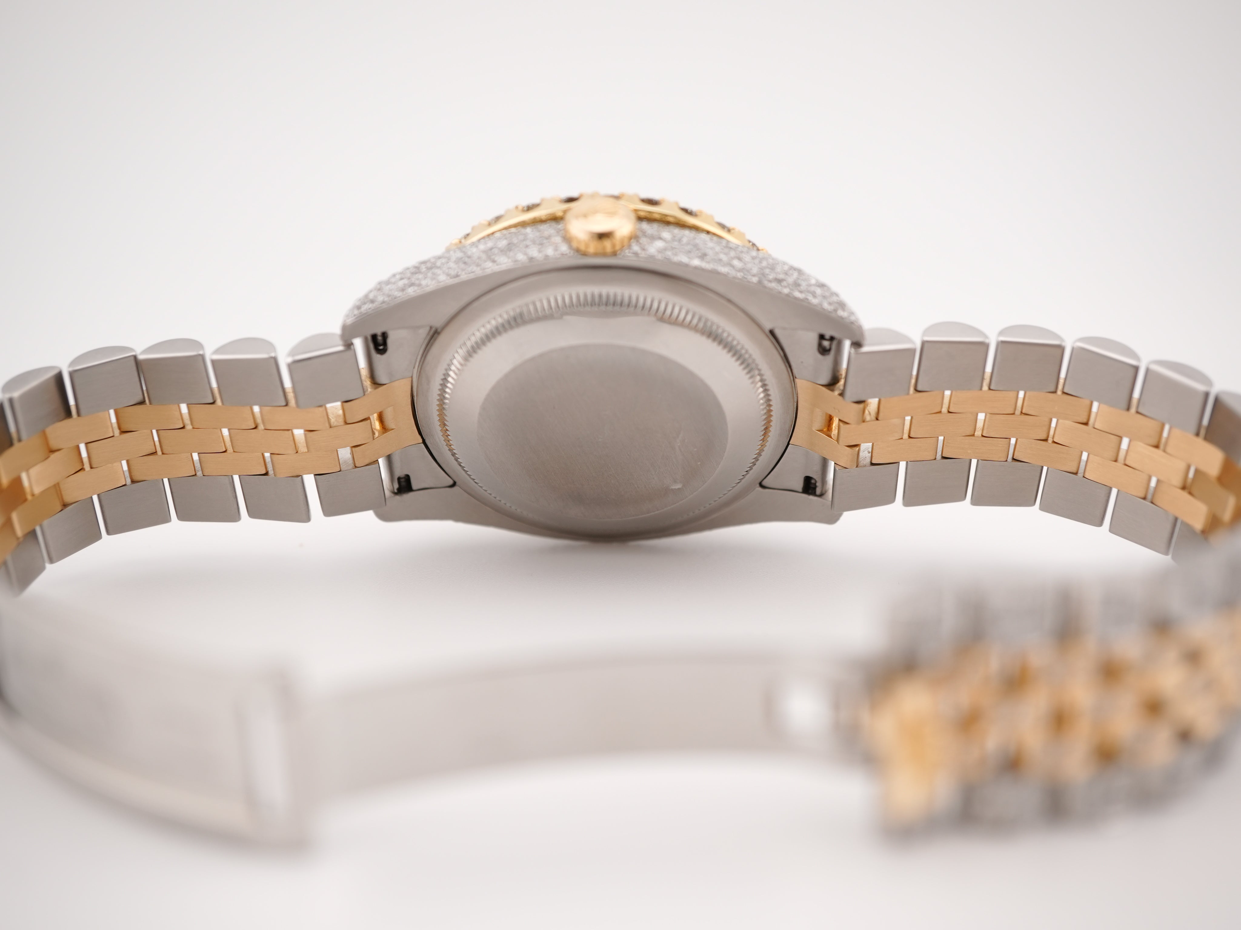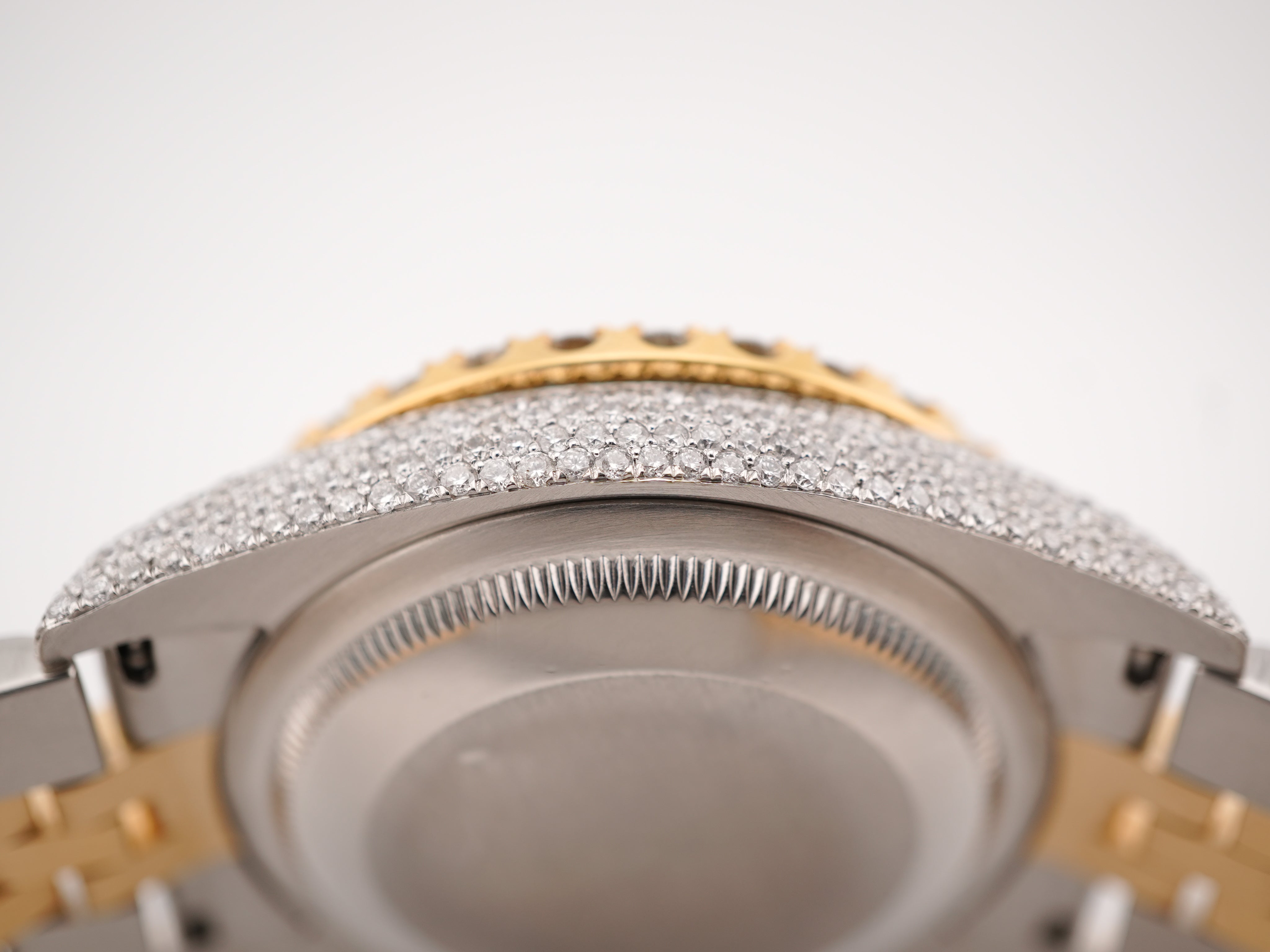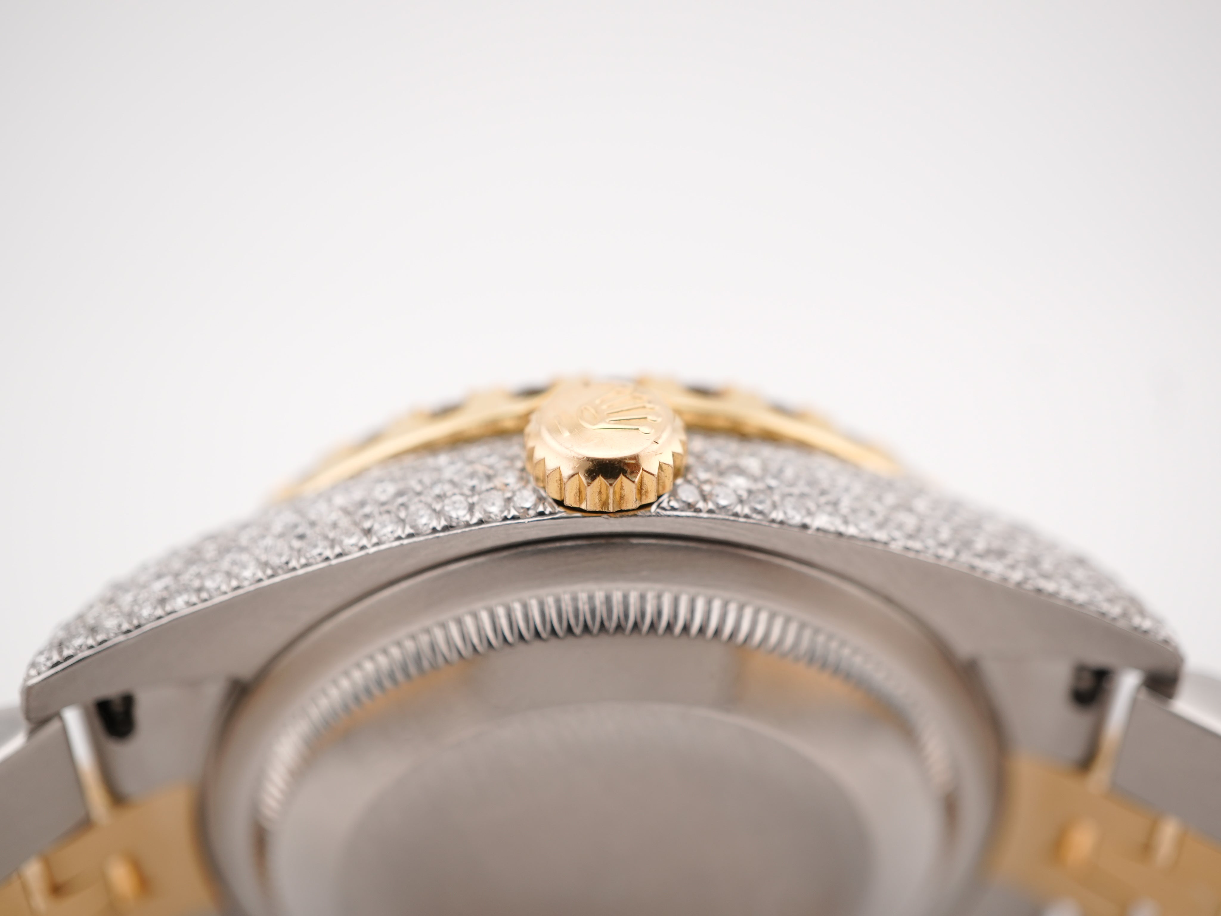 The Rolex Datejust 116233 features a 36mm stainless steel and 18K yellow gold case, custom diamond bezel, pavé diamond dial with Arabic numerals, and a two-tone Jubilee bracelet. Includes the original Rolex box.