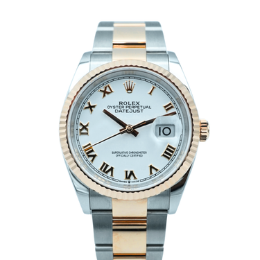 The 2023 Rolex Datejust 36 mm ref. 126231 features a white Roman numeral dial, fluted 18K Everose gold bezel, and two-tone stainless steel and rose gold Oyster bracelet. This complete set is 100 % authentic and expert verified, includes the original Rolex box and papers, and ships with free insured shipping.