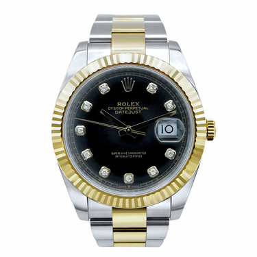 The Rolex 126333 Datejust 41mm features a bold black dial with diamond hour markers, elegant 18K yellow gold fluted bezel, and a durable two-tone Oyster bracelet. This 2023 complete set includes the original Rolex box and papers.