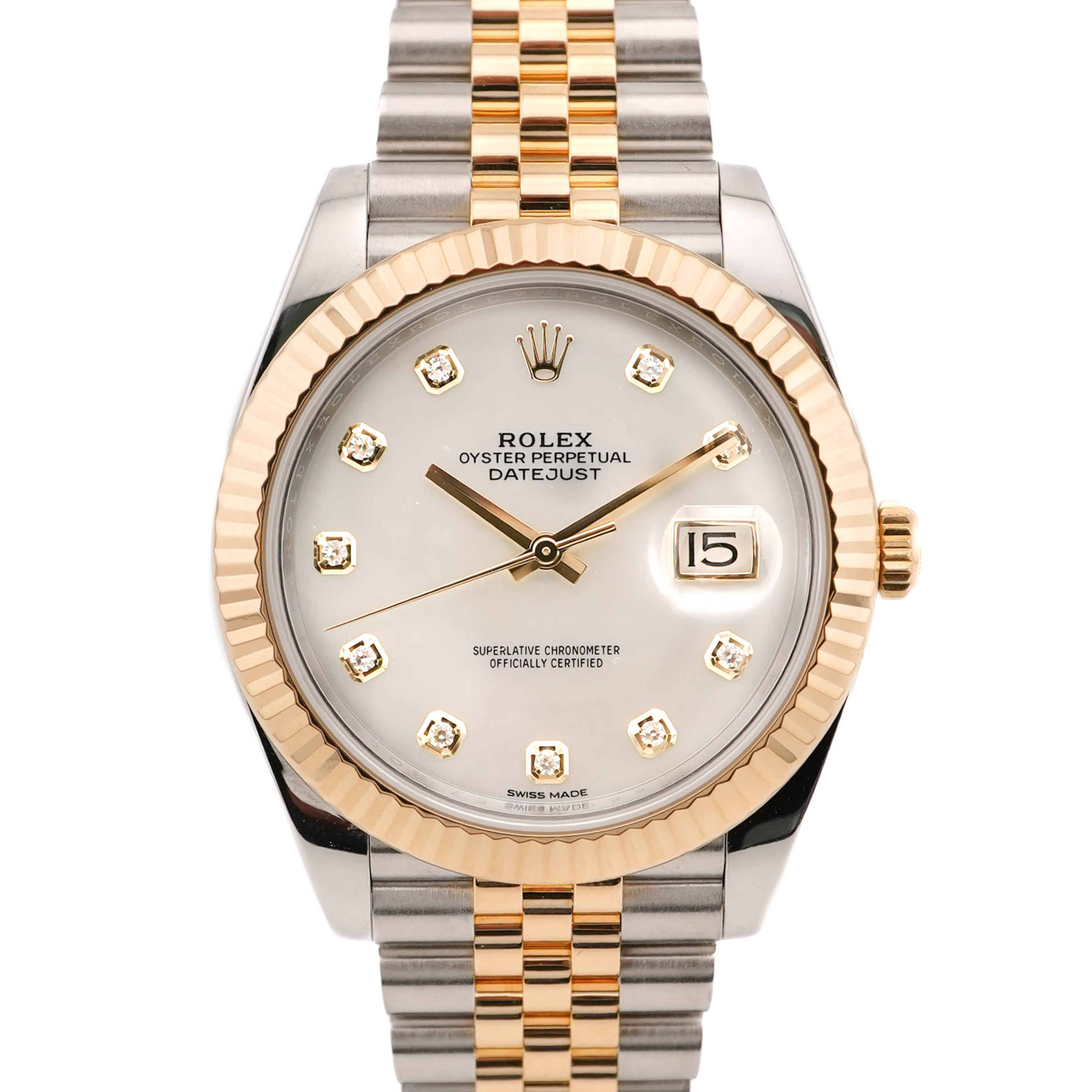 The Rolex Datejust 126333 features a 41mm stainless steel and 18K yellow gold case, fluted bezel, white mother of pearl dial with factory diamond hour markers, and a two-tone Jubilee bracelet. This complete 2018 set includes the original Rolex box and papers.