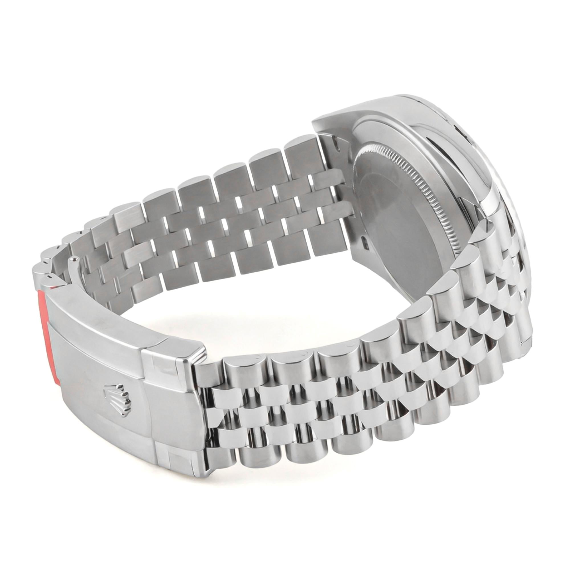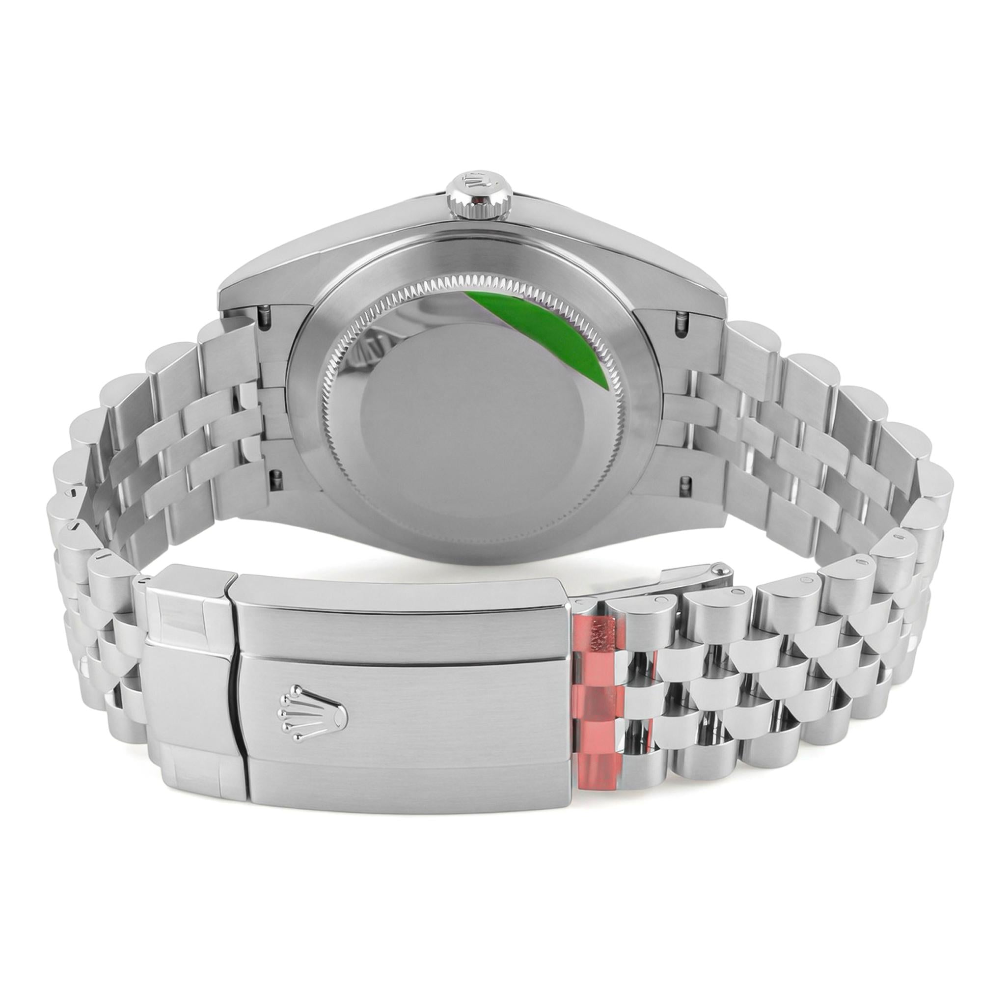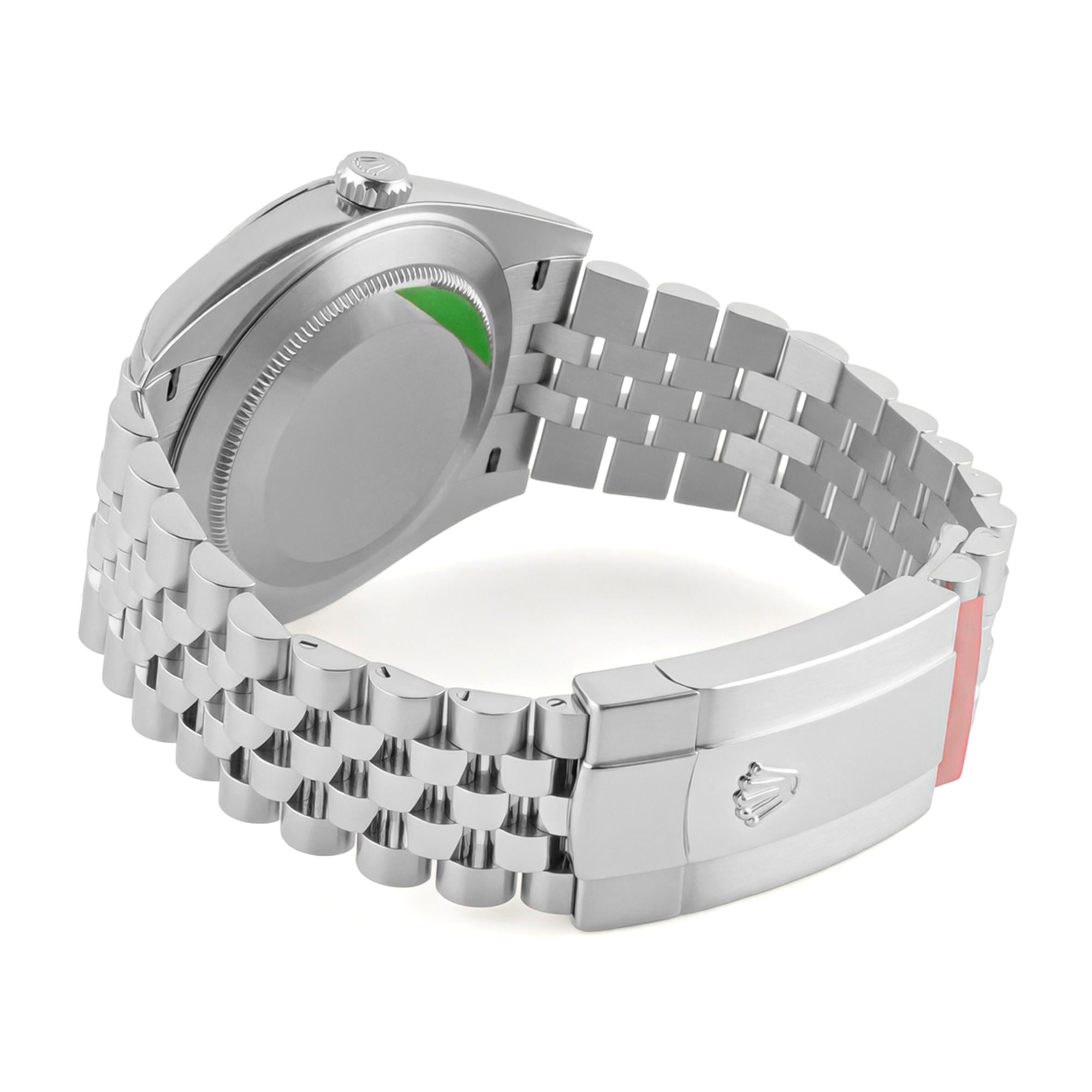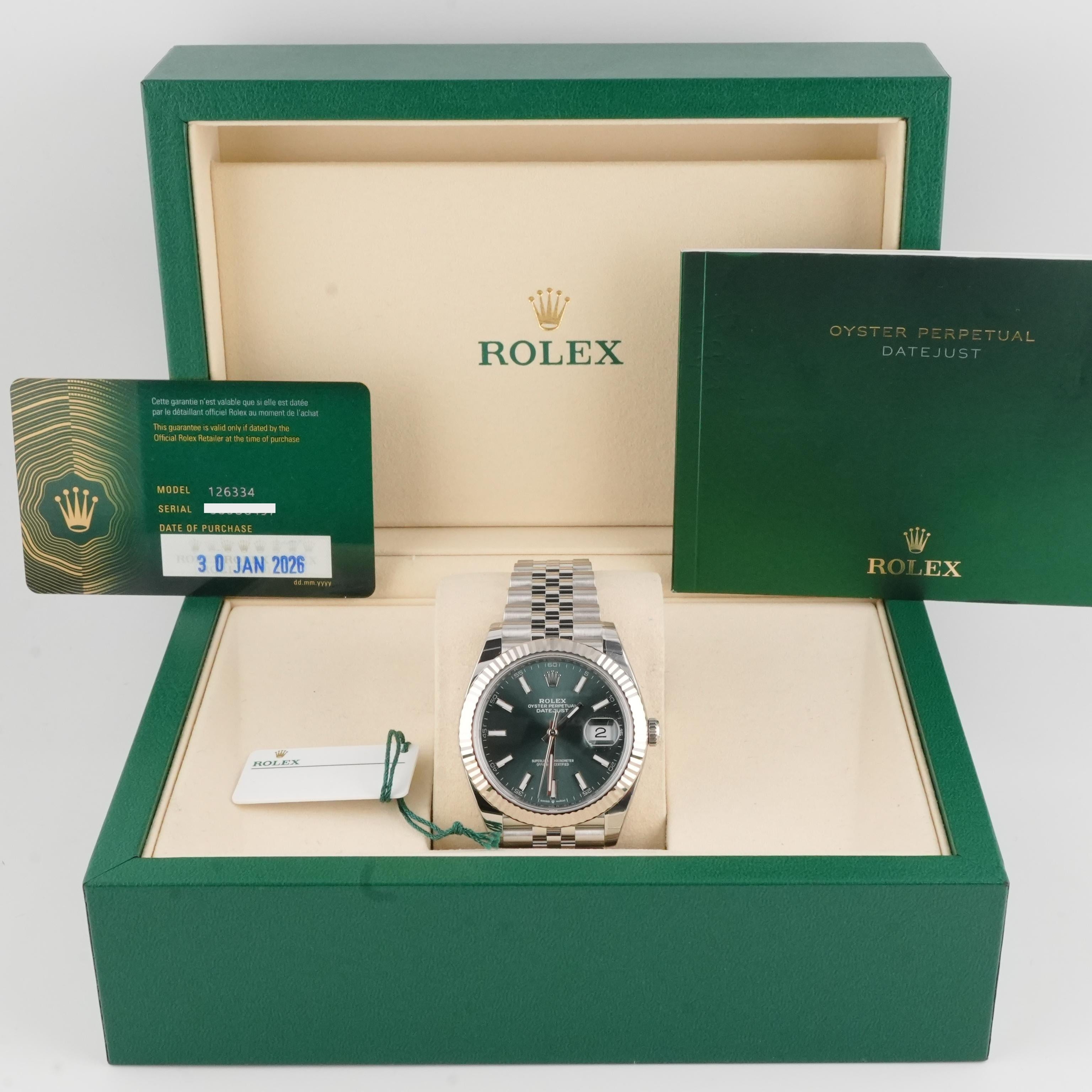 This unworn Rolex Datejust 41mm (Ref. 126334) in stainless steel with an 18k white gold fluted bezel and stunning mint green dial on a Jubilee bracelet comes complete with box and papers as shown in the photos, including the original Rolex warranty card dated 2026. All parts strictly factory original, zero aftermarket components. In stock and ready for immediate shipment with free, fully insured overnight shipping. Guaranteed 100% authentic, backed by our 2-year warranty — buy with complete confidence.
