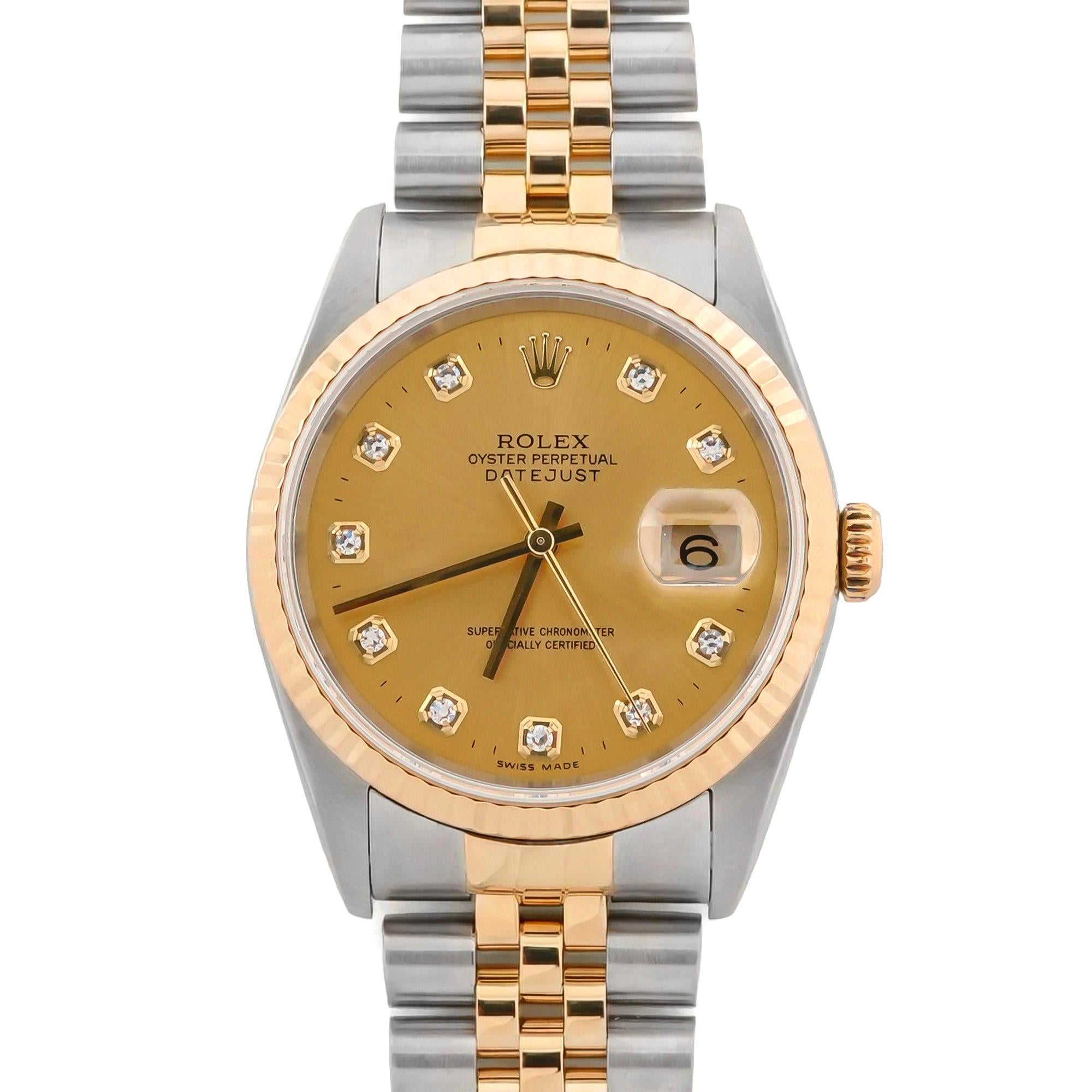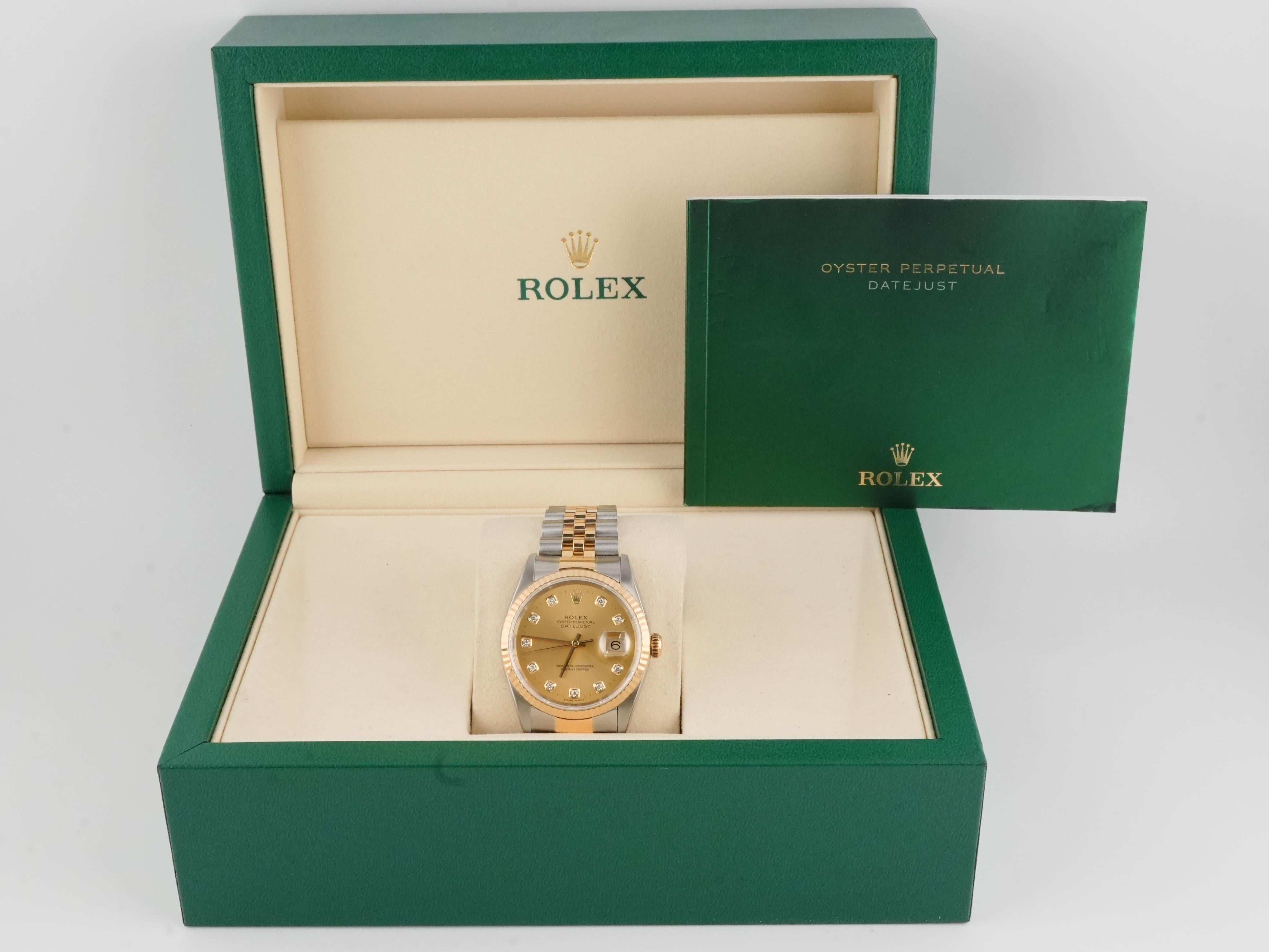 Rolex 16233 Datejust 36 mm Fluted Bezel Champagne Diamond Dial Jubilee Bracelet Box 2002