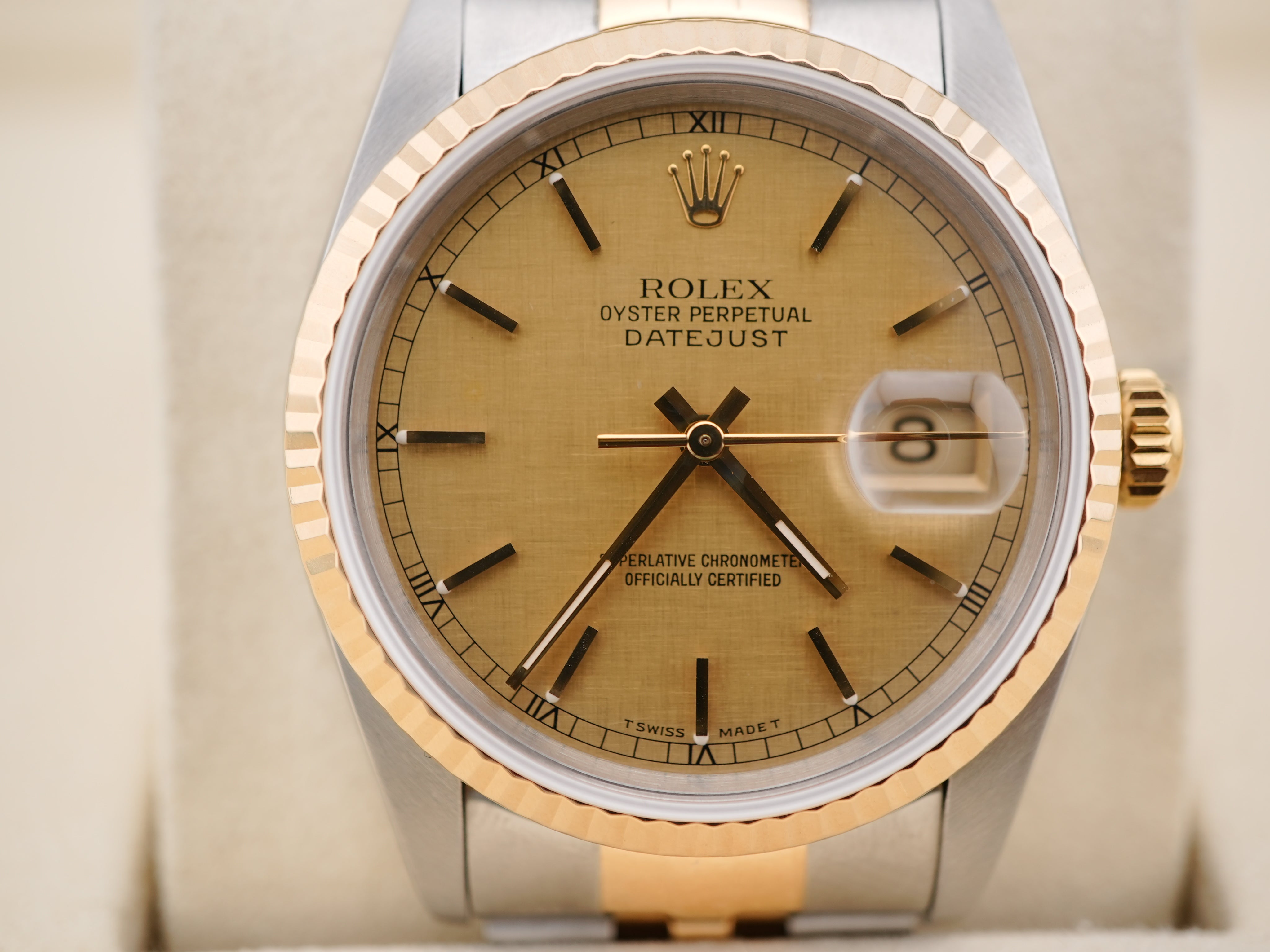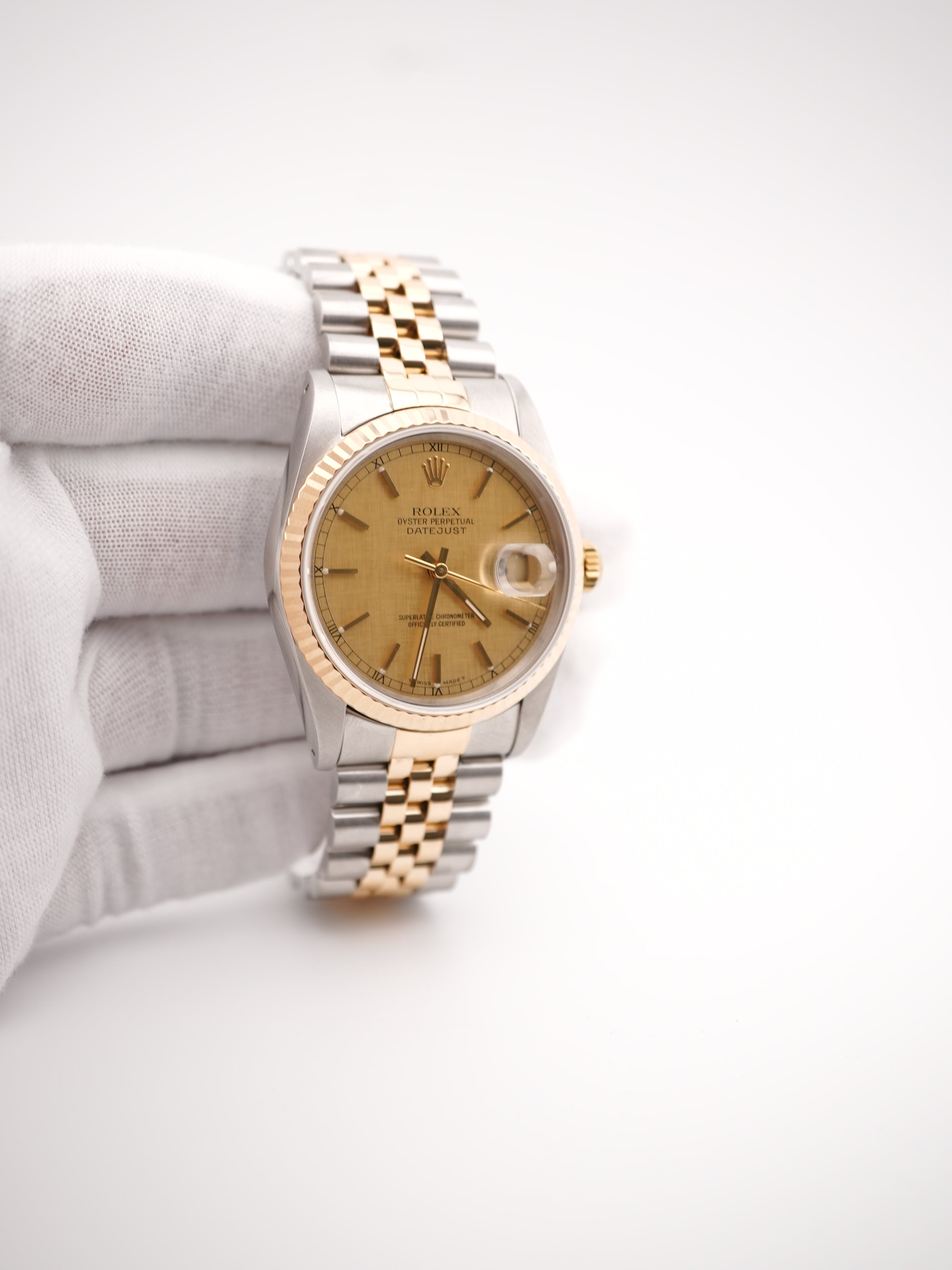 Rolex 16233 Datejust 36 mm Fluted Bezel Champagne Linen Dial Jubilee Bracelet Box and Papers 1990