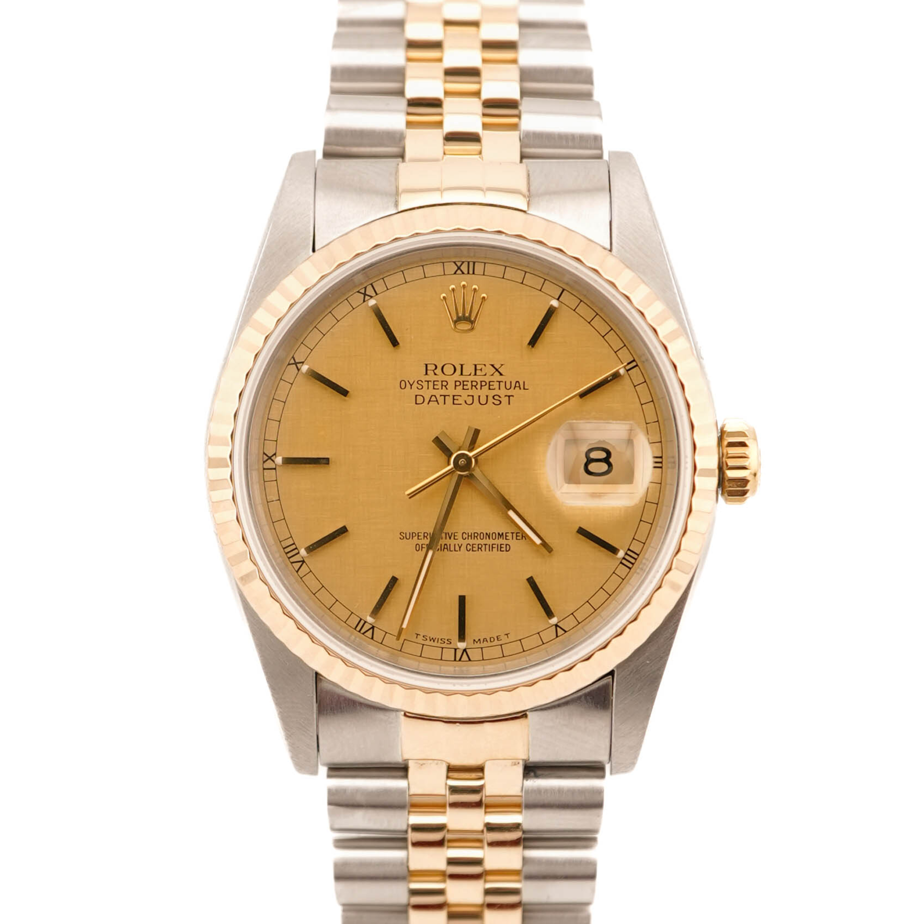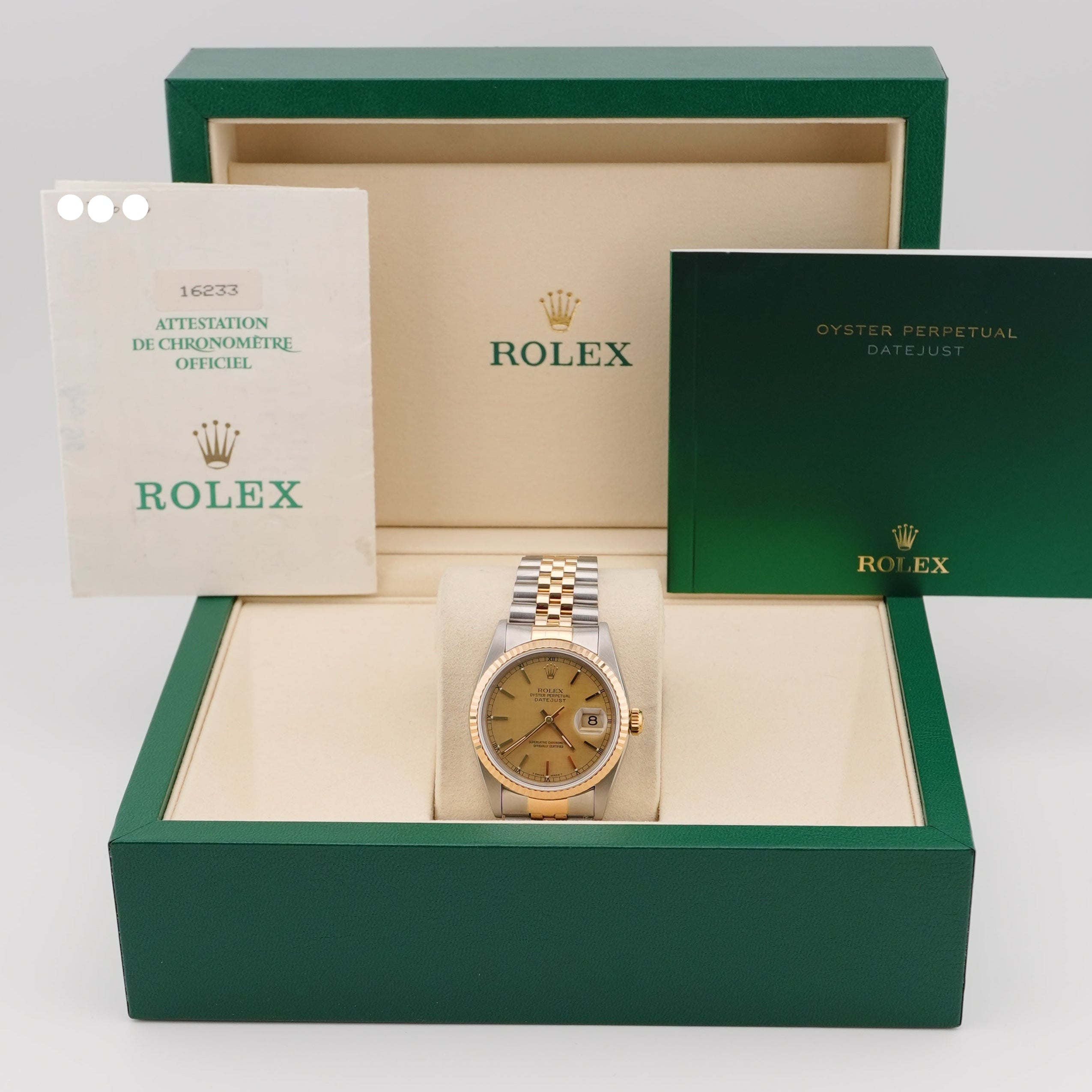 The Rolex Datejust 16233 features a 36mm stainless steel and 18K yellow gold case, fluted bezel, champagne linen-textured dial with gold index hour markers, and a two-tone Jubilee bracelet. This complete 1990 set includes the original Rolex box and papers.
