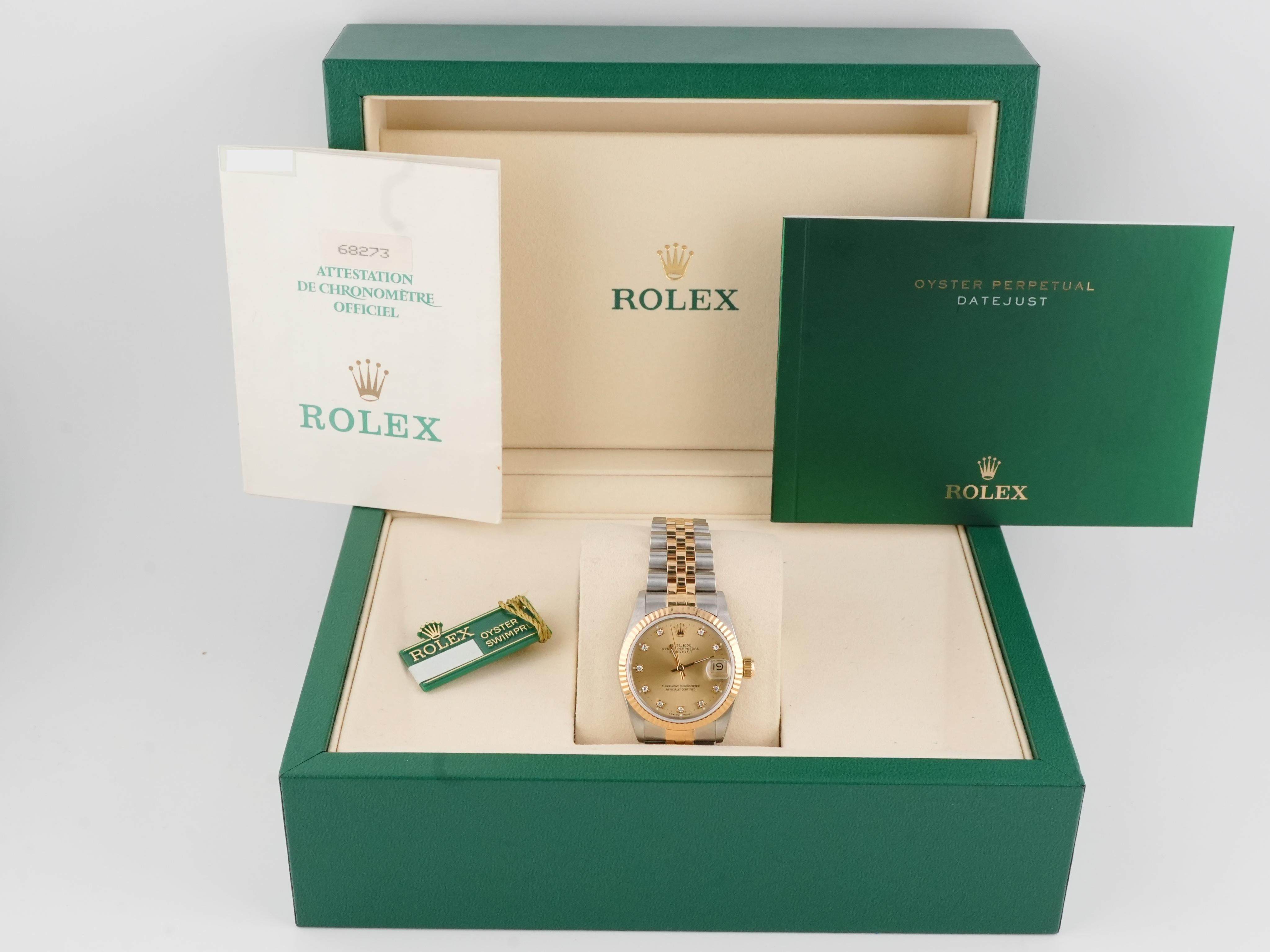 Rolex 68273 Datejust 31 mm Fluted Bezel Champagne Diamond Dial Jubilee Bracelet Box and Papers 1989