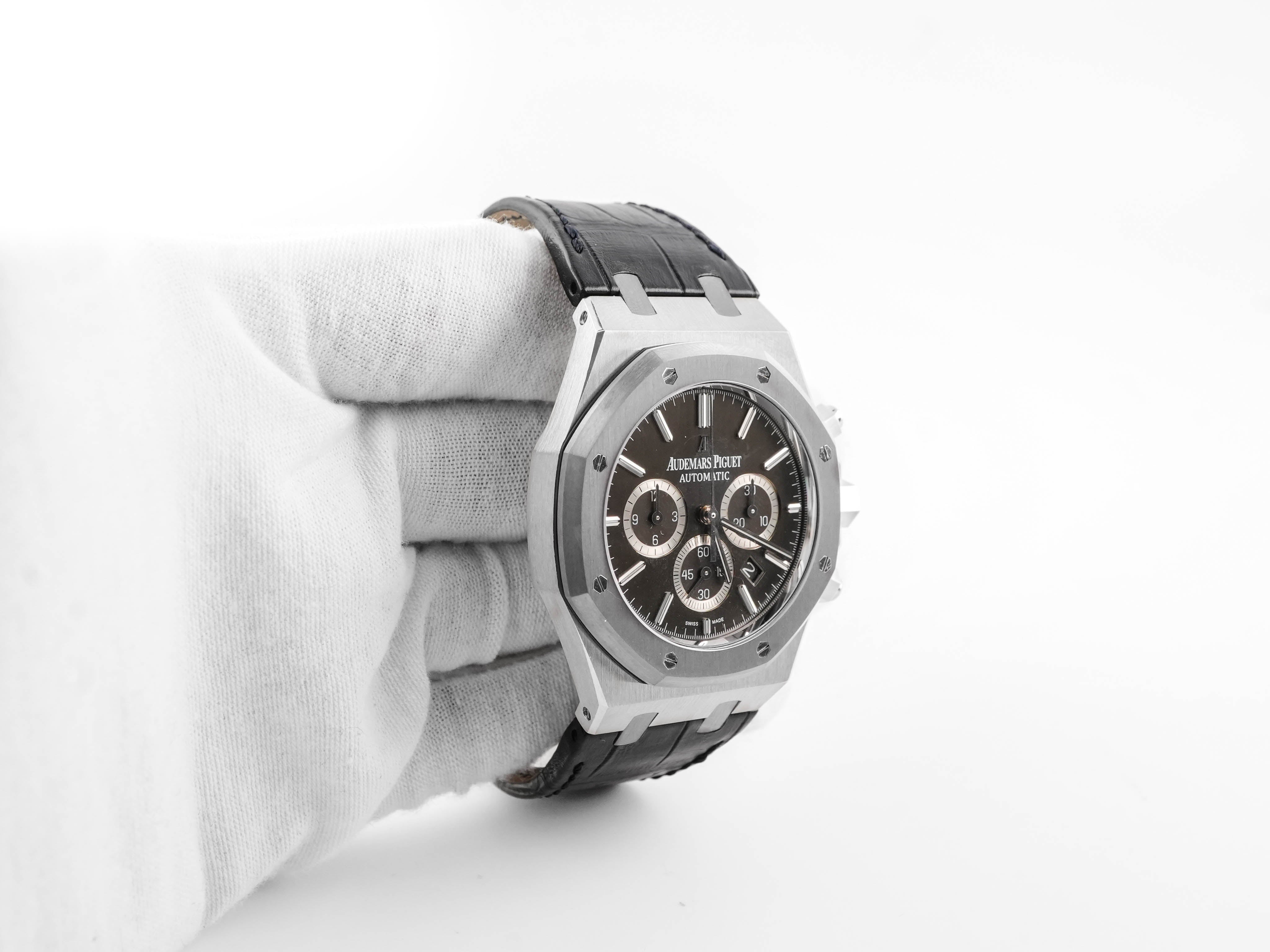 This Audemars Piguet Royal Oak Chronograph ref. 26325TS.OO.D005CR.01 comes complete with box and papers and is in very good condition. It has been professionally serviced and shows no scratches. This pre-owned watch includes the original Audemars Piguet box and original warranty/authentication certificate dated 2013, as shown in the photos. It is in stock and ready to ship immediately with free, fully insured shipping.