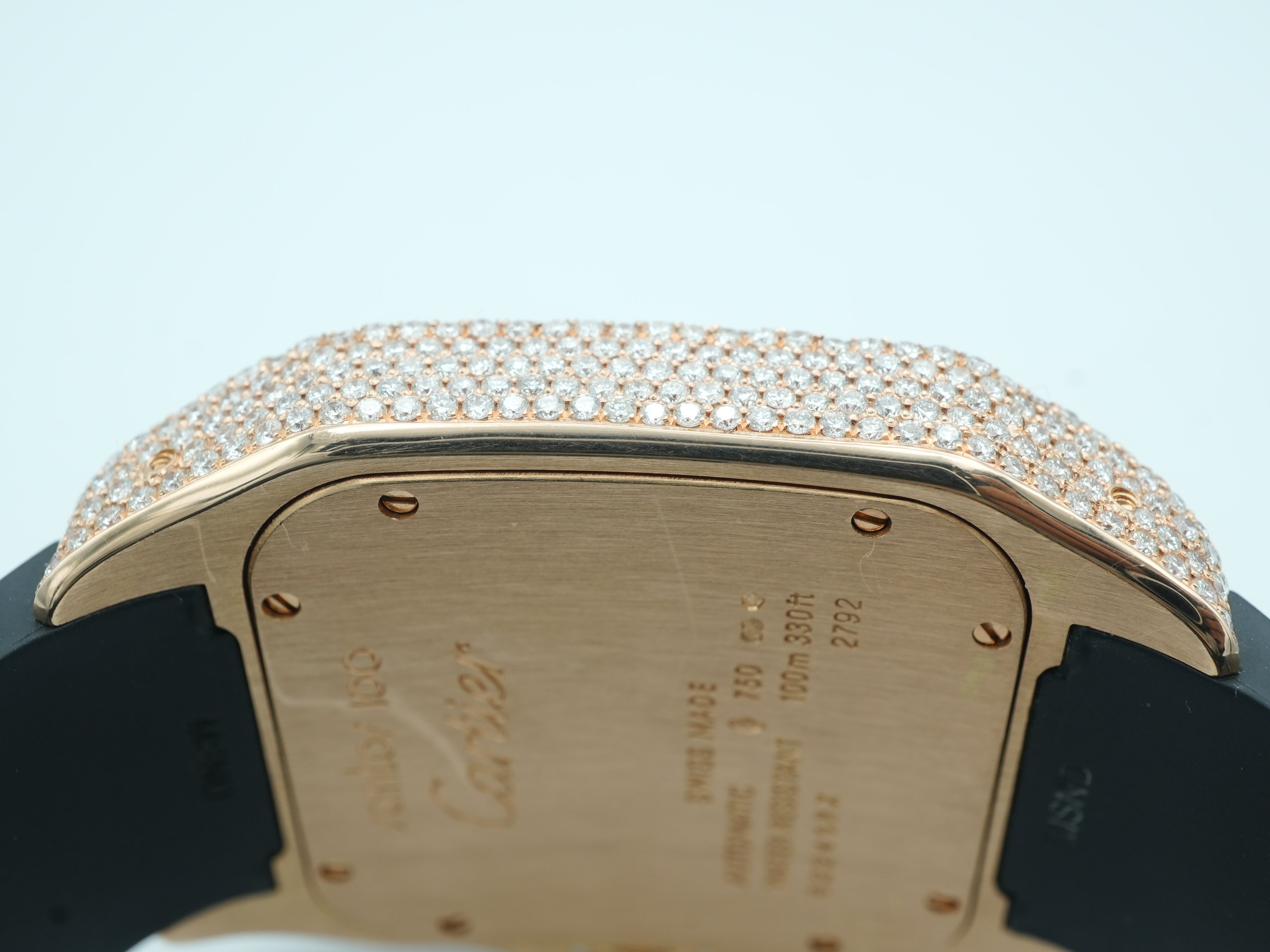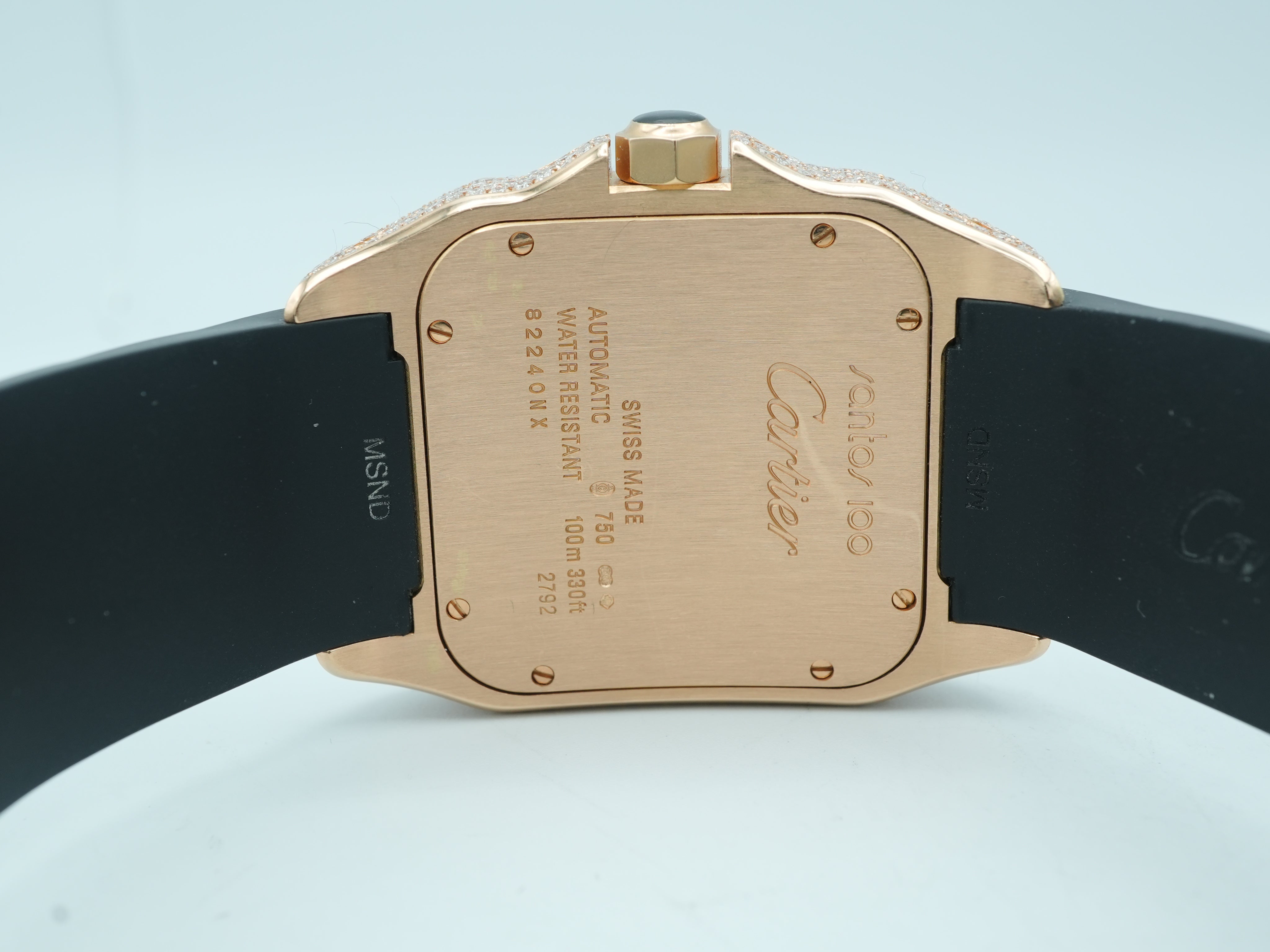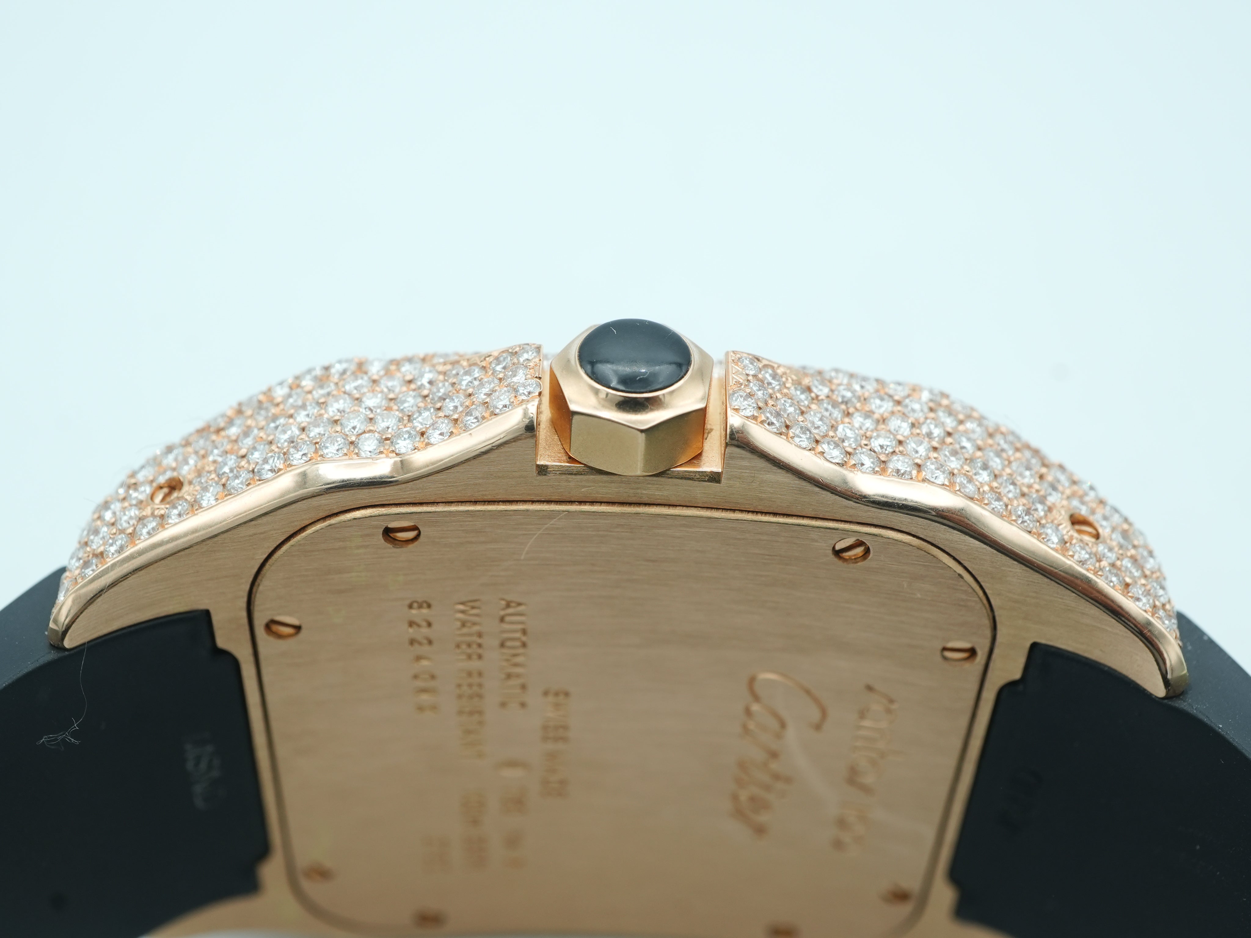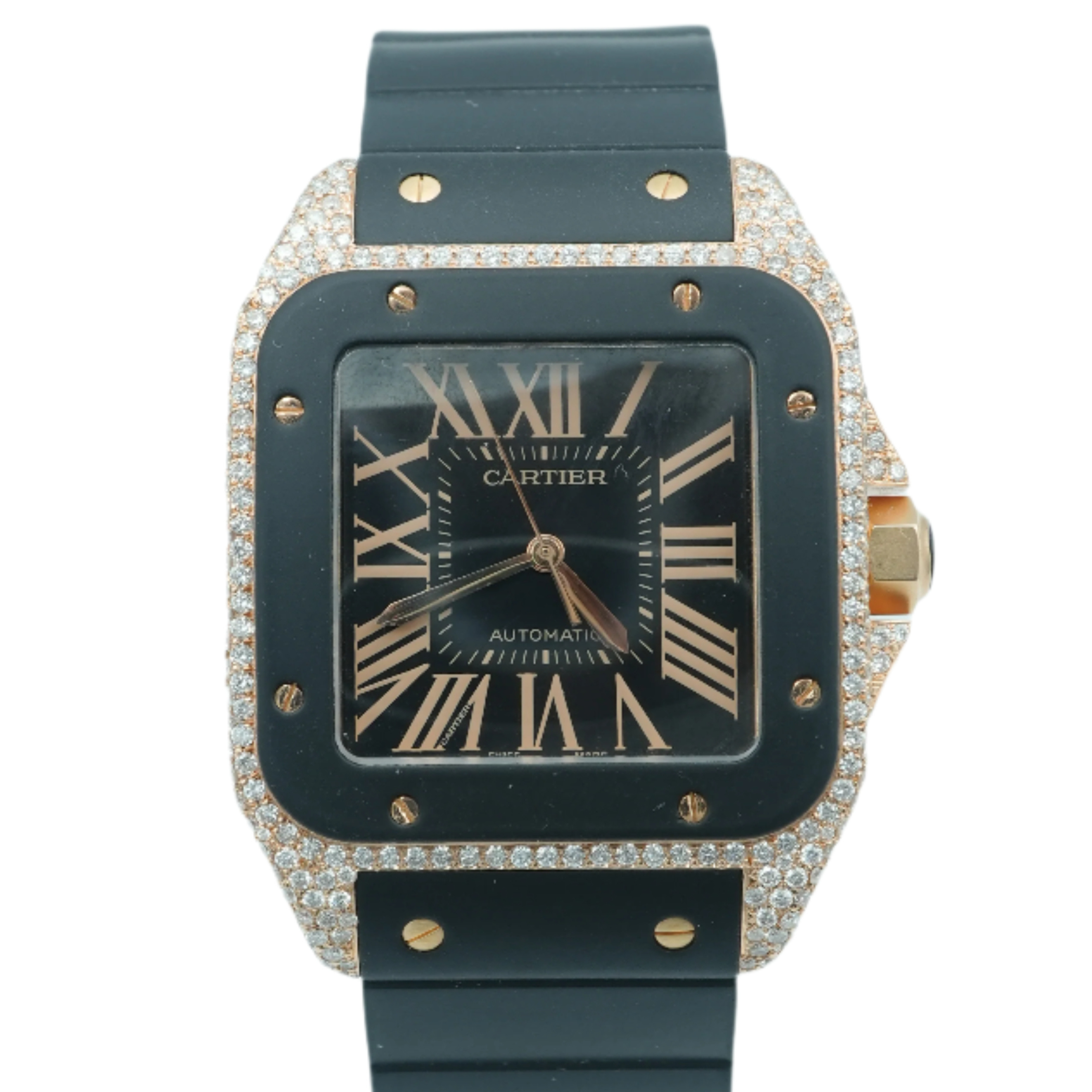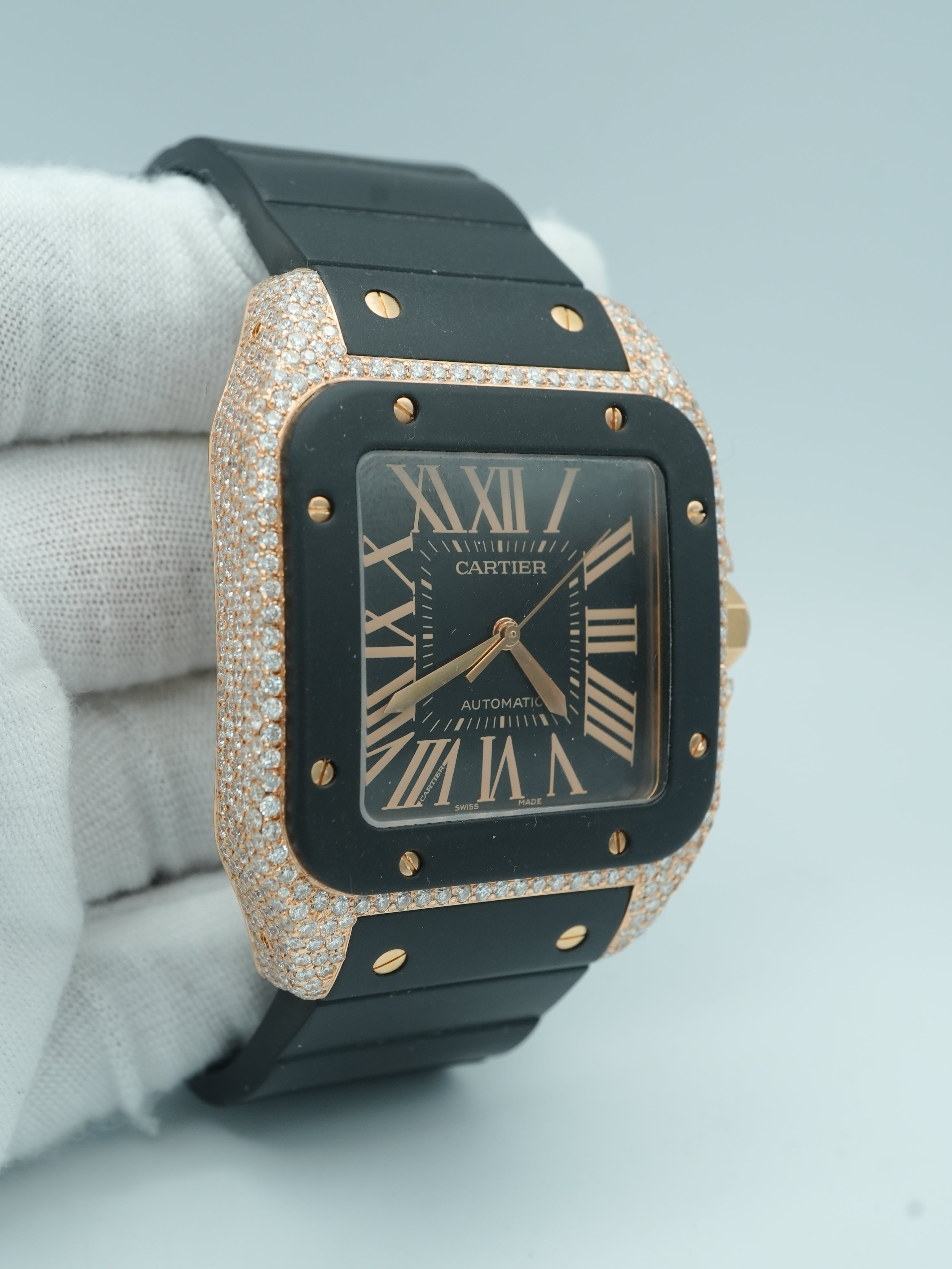 Cartier Santos 100 Large 18K Rose Gold Fully Iced Out Black Roman Dial Rubber Strap 2008