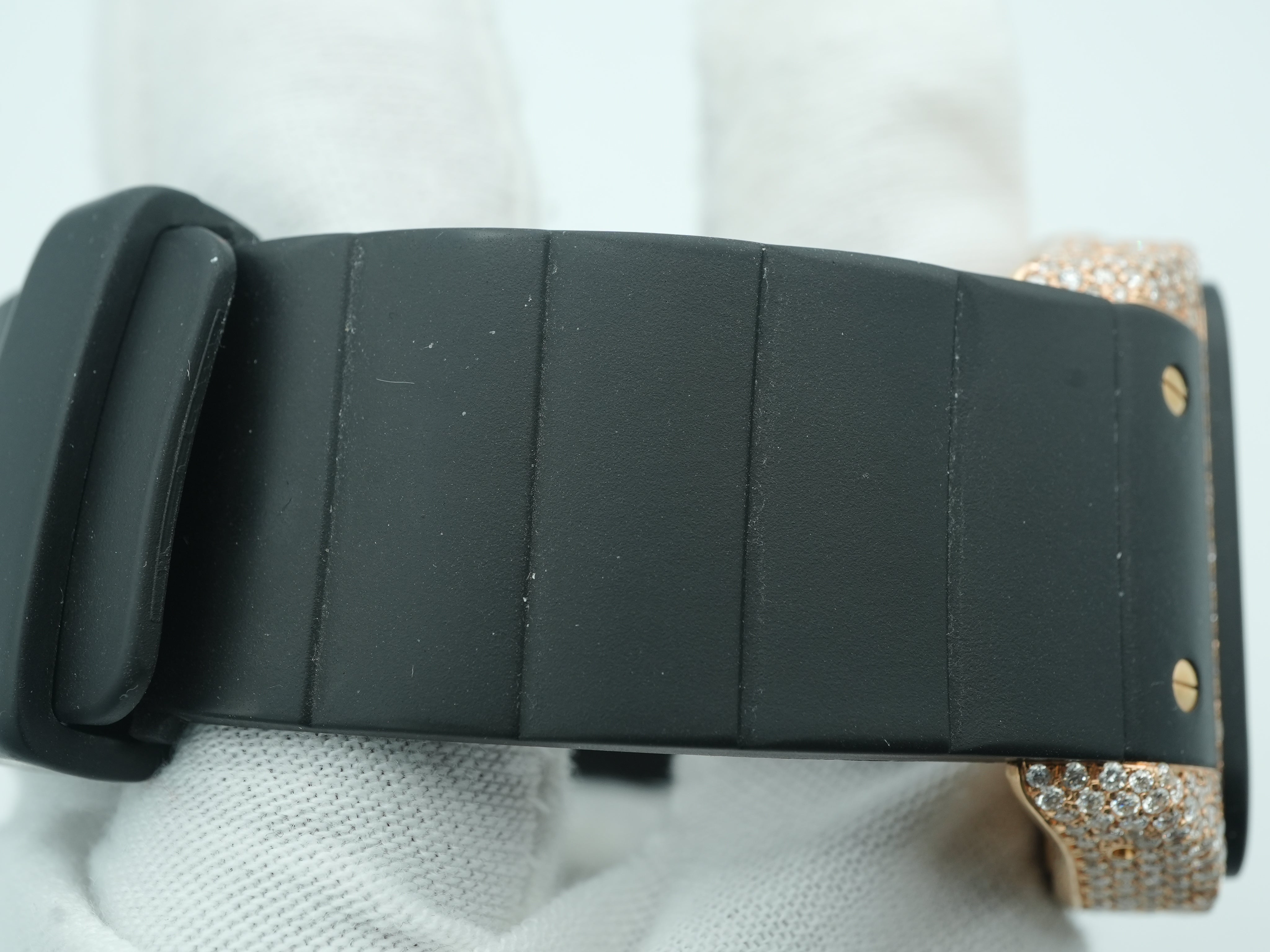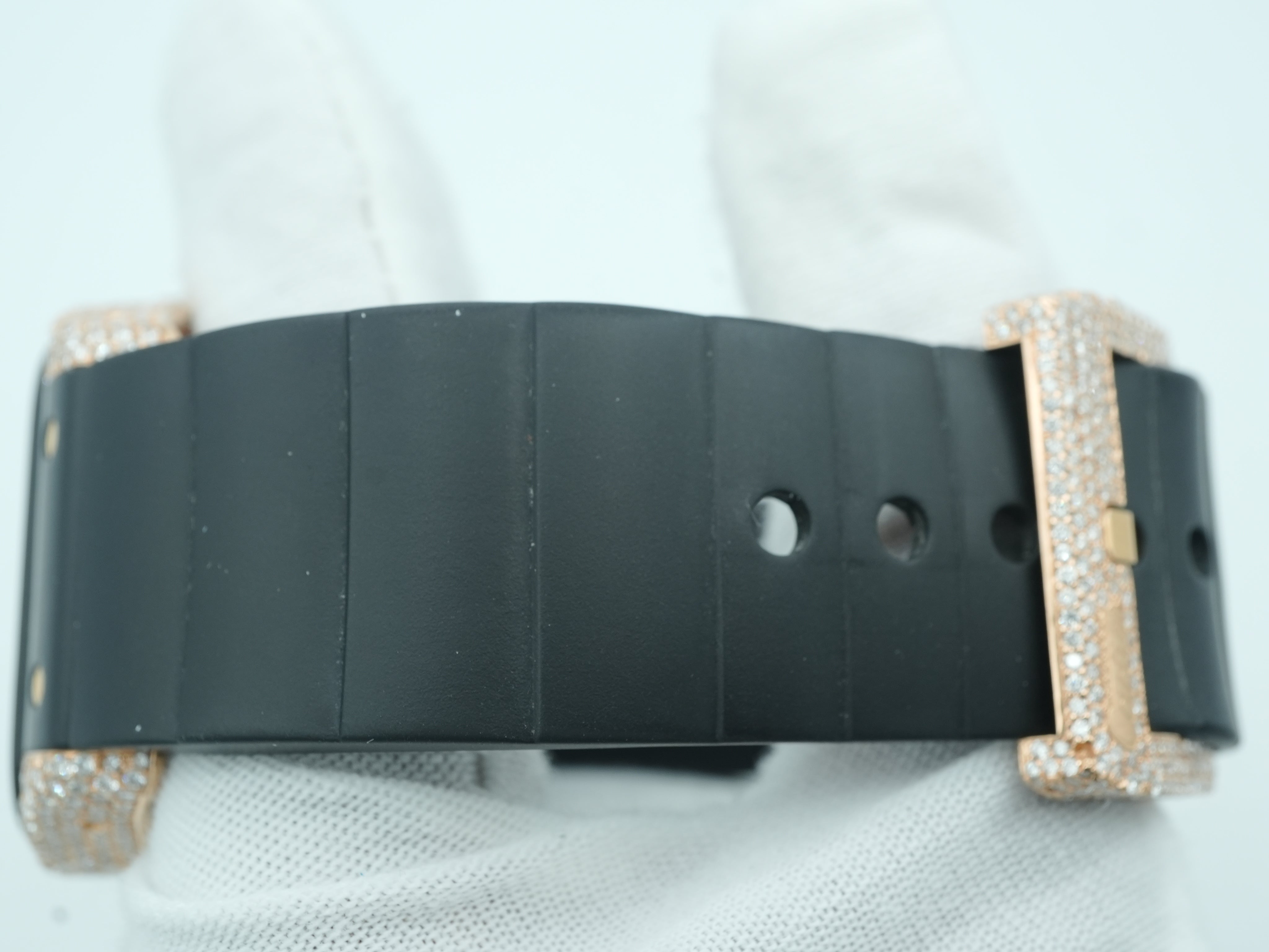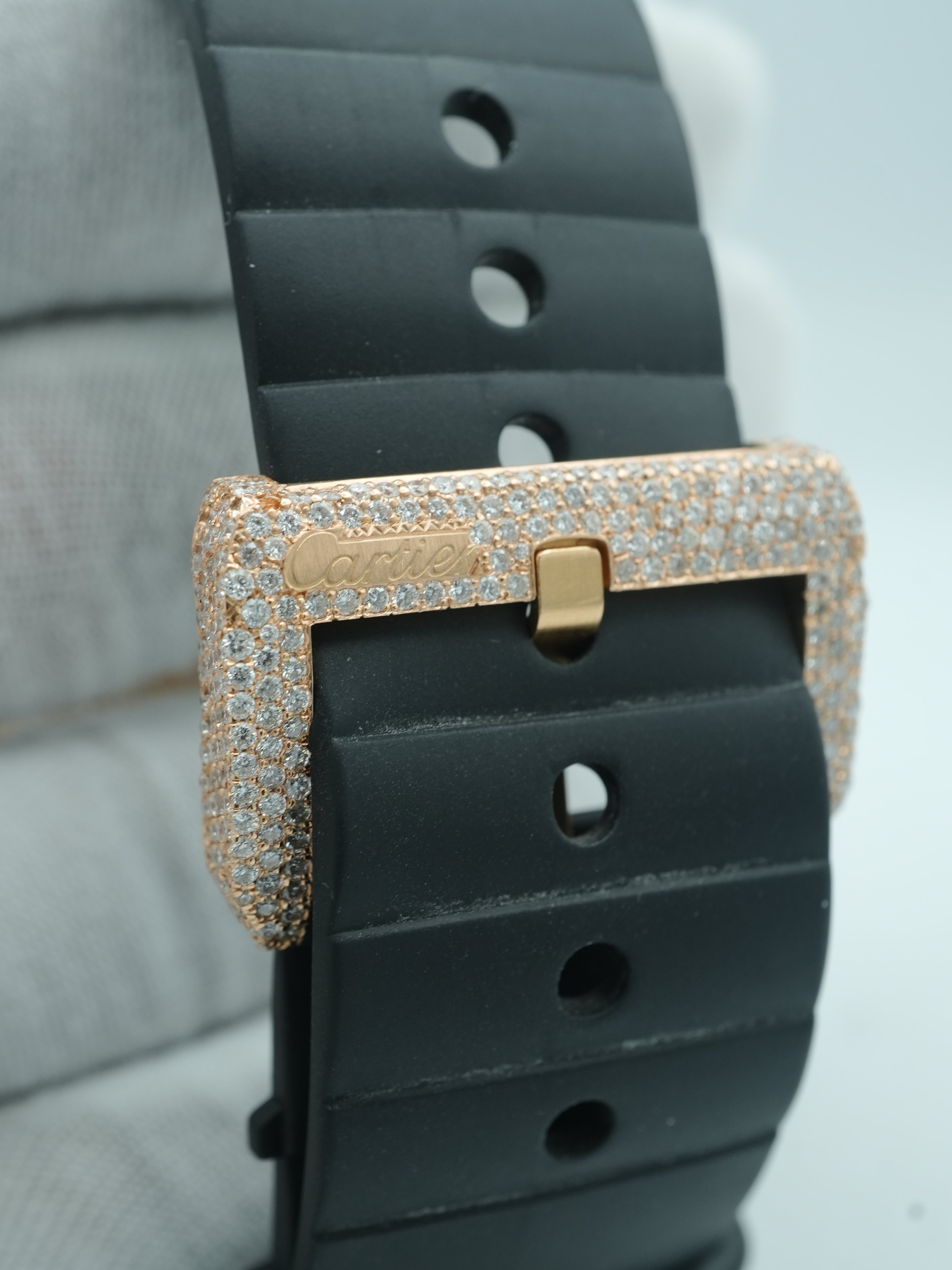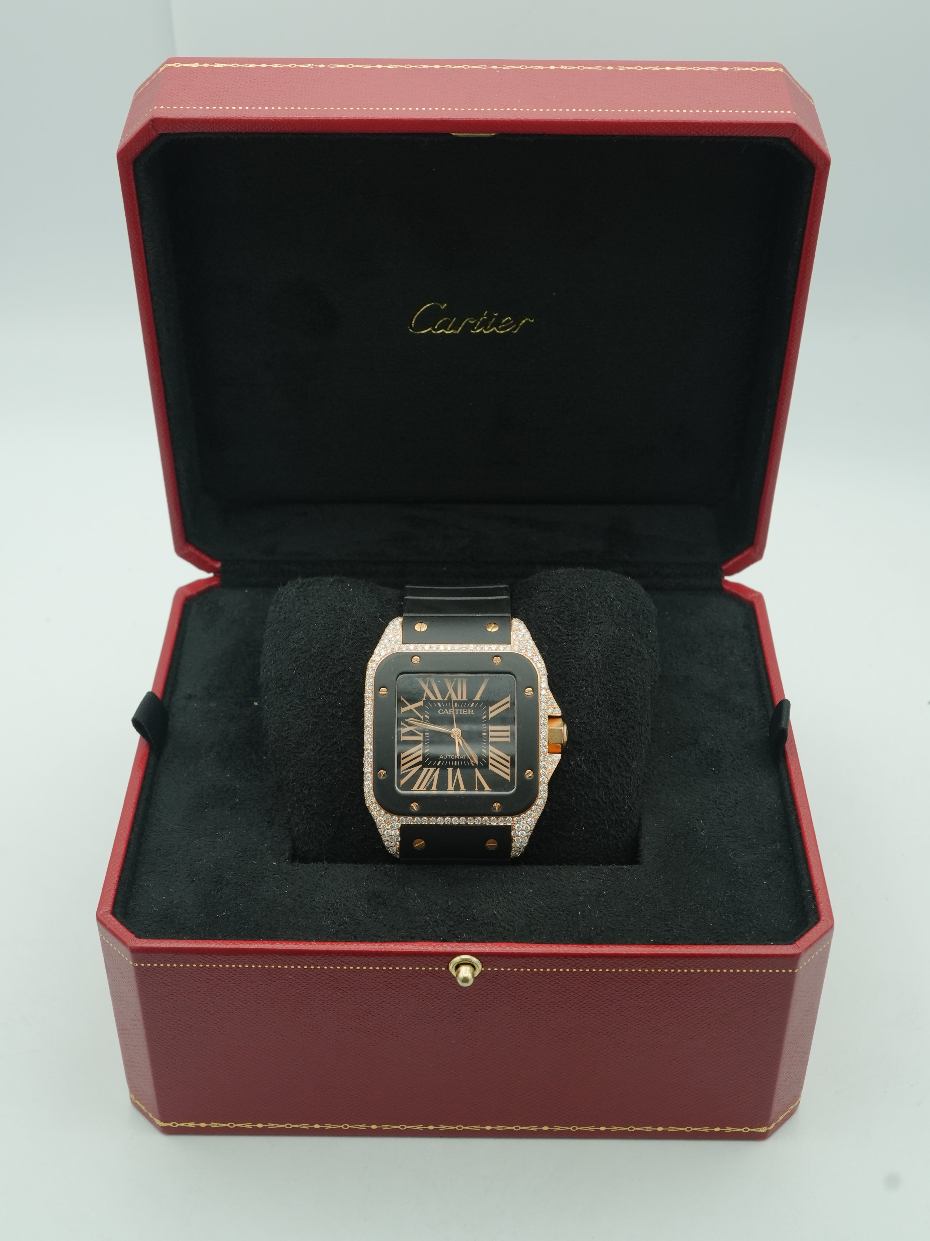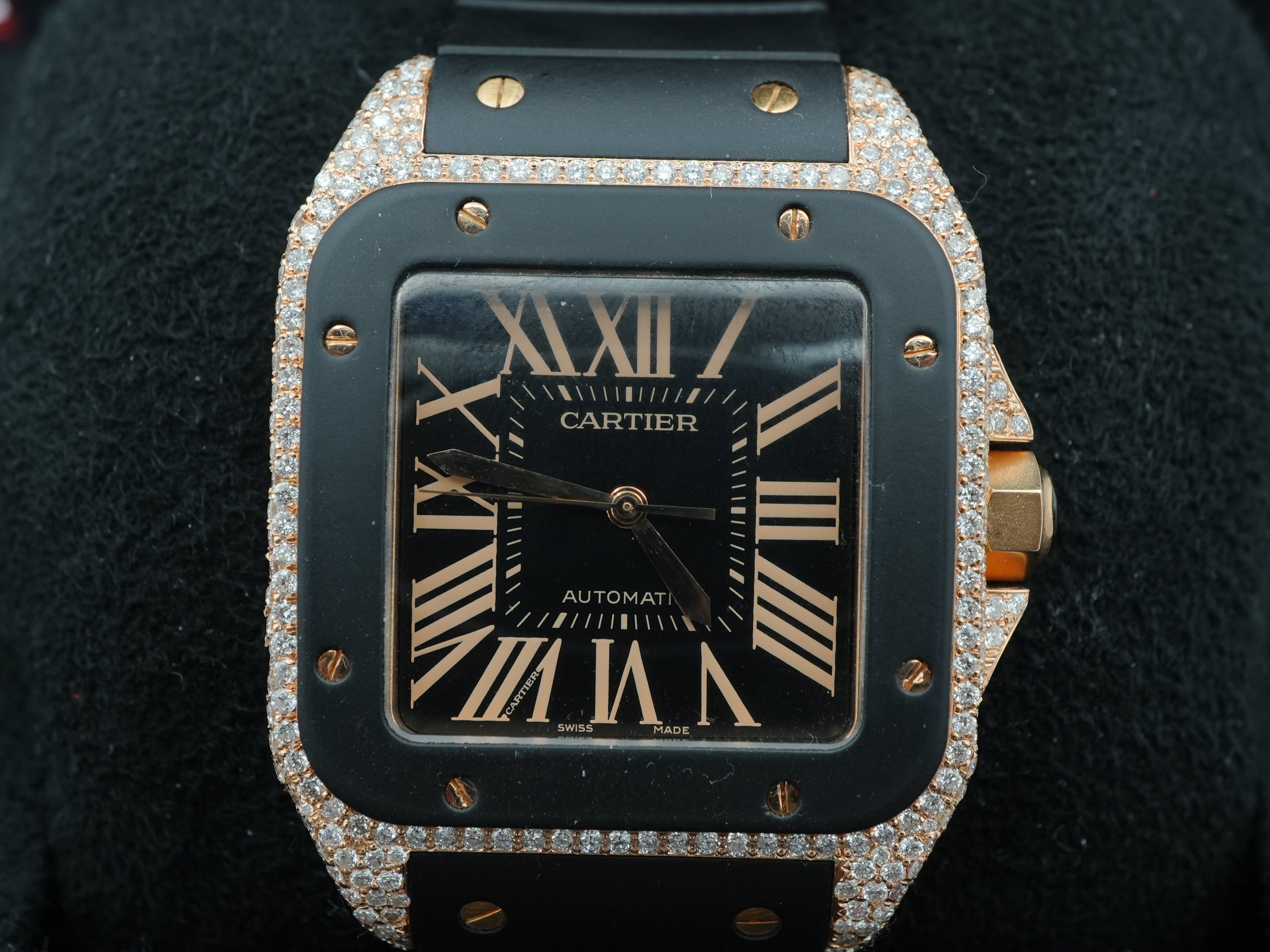 Cartier Santos 100 Large 18K Rose Gold Fully Iced Out Black Roman Dial Rubber Strap 2008