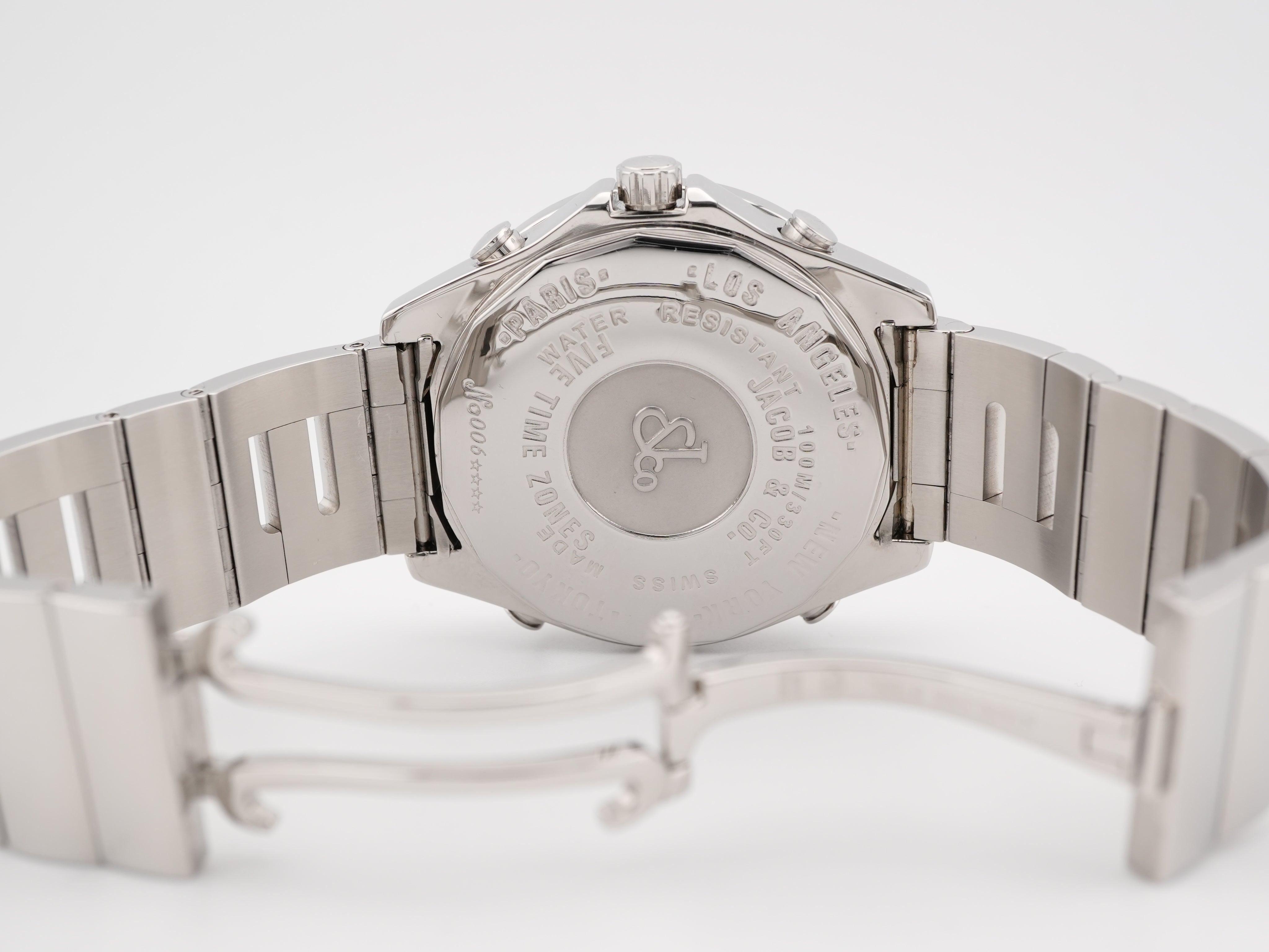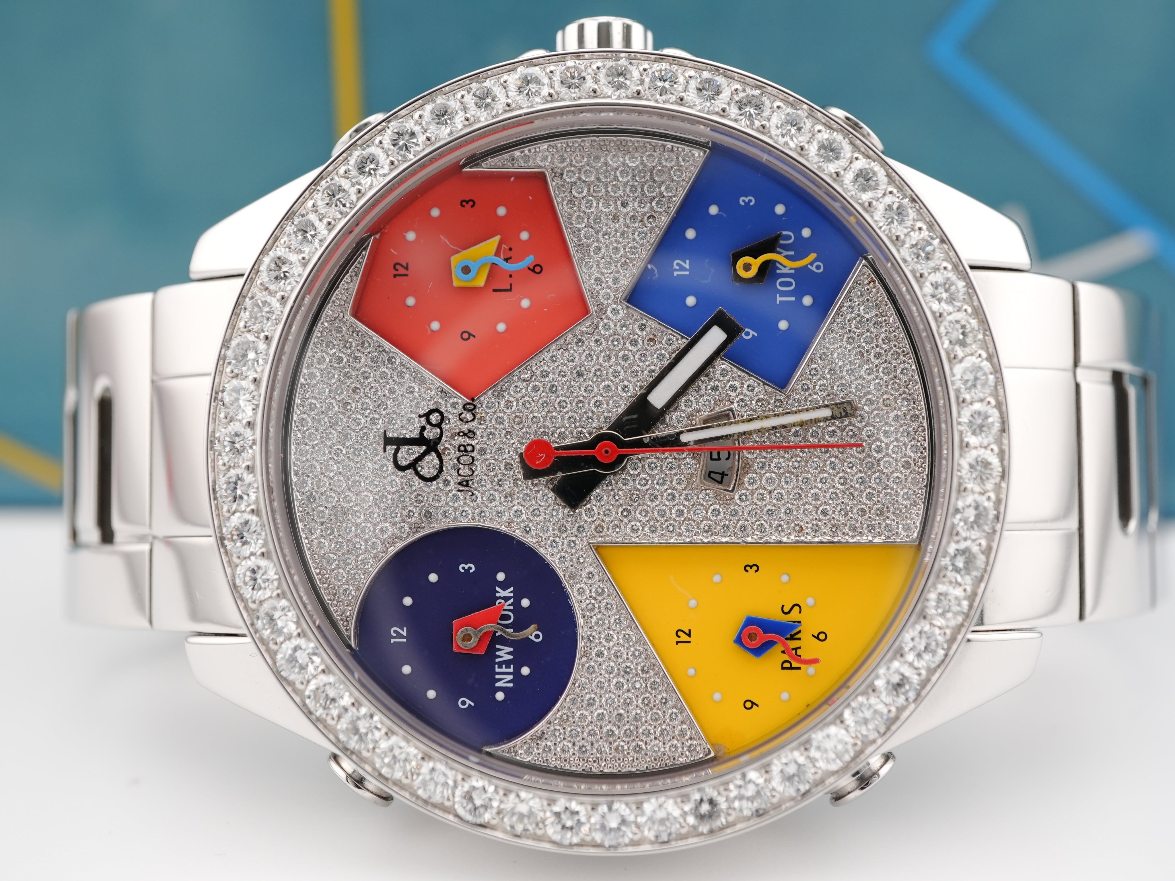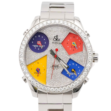 The 2005 Jacob & Co. Five Time Zone watch features a full pavé diamond dial, diamond-set bezel, and displays for four global time zones plus home time. This bold and luxurious statement piece is 100 % authentic and expert verified, includes the original Jacob & Co. box and papers, and ships with free insured shipping.