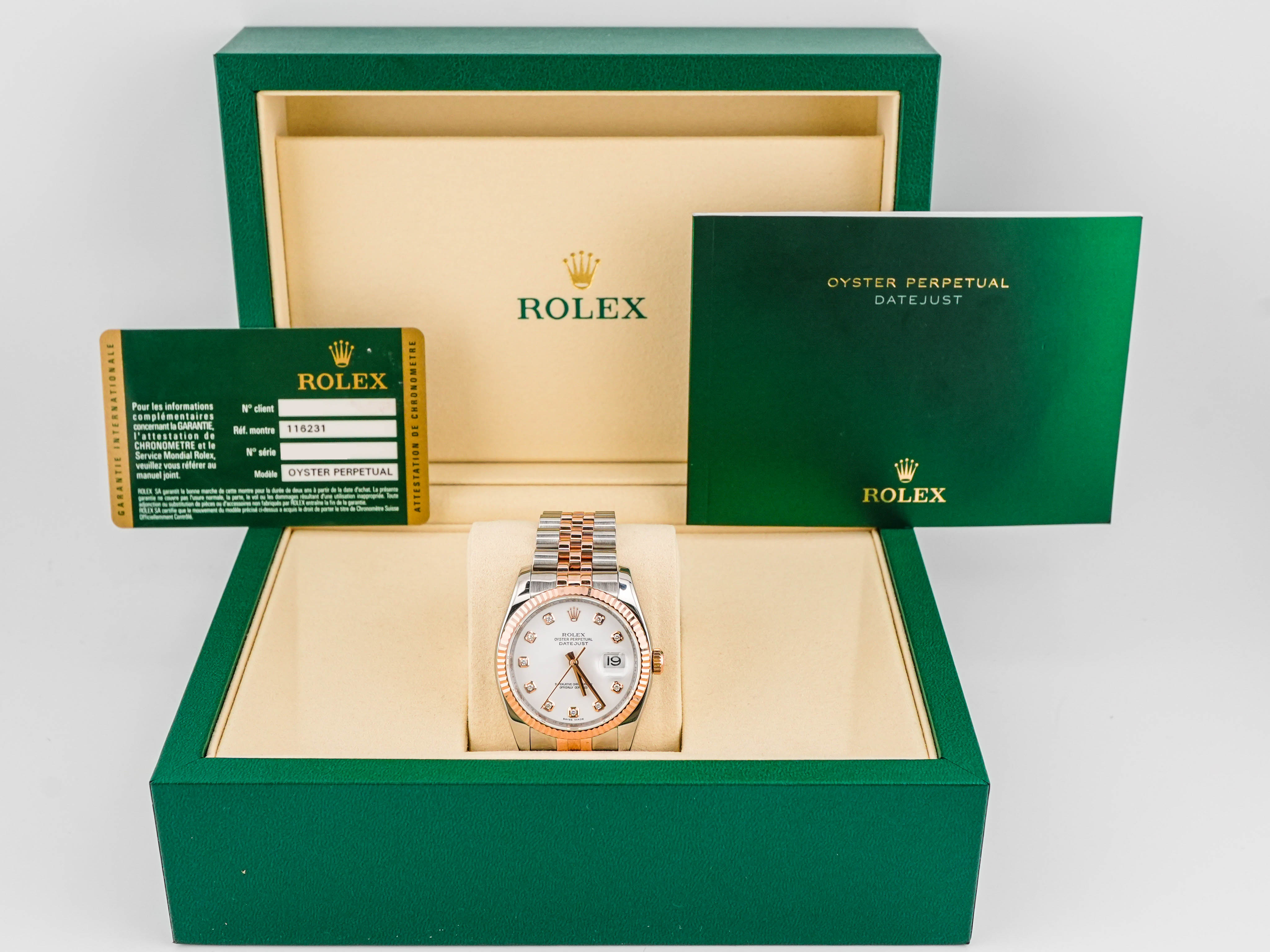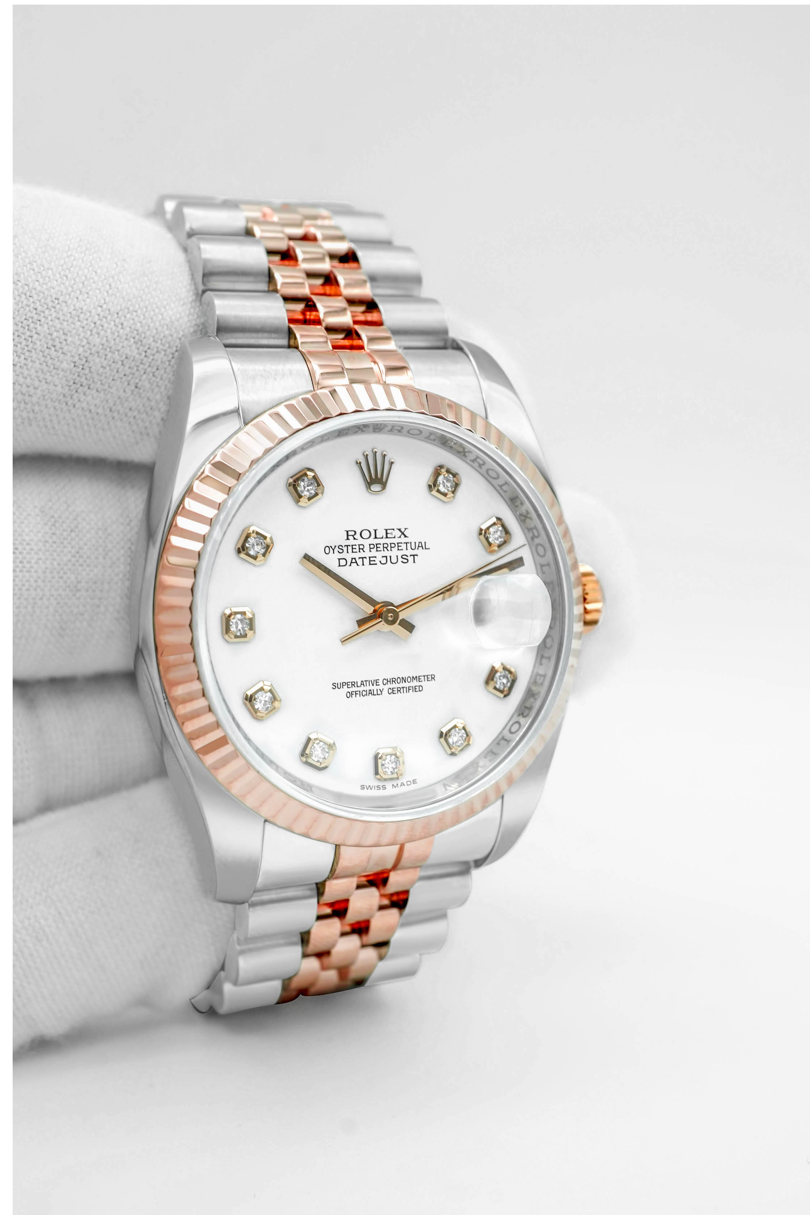 Rolex 116231 Datejust 36 mm 18K Rose Gold White Diamond Dial Jubilee Bracelet Box and Papers 2009