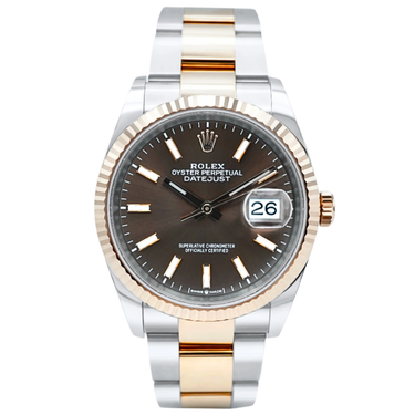 The Rolex 126231 Datejust 36mm features a rich brown index dial, refined 18K Everose gold fluted bezel, and a sleek Oyster bracelet in stainless steel and rose gold. This 2024 complete set includes the original Rolex box and papers.