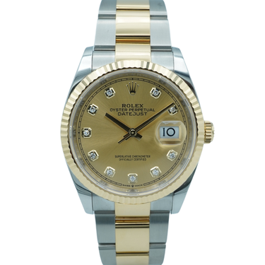 The Rolex 126233 Datejust 36mm features an 18K yellow gold fluted bezel, champagne diamond dial, and a stainless steel and yellow gold Oyster bracelet for a timeless, luxurious look. A complete set from 2023, it comes with the original Rolex box and papers.