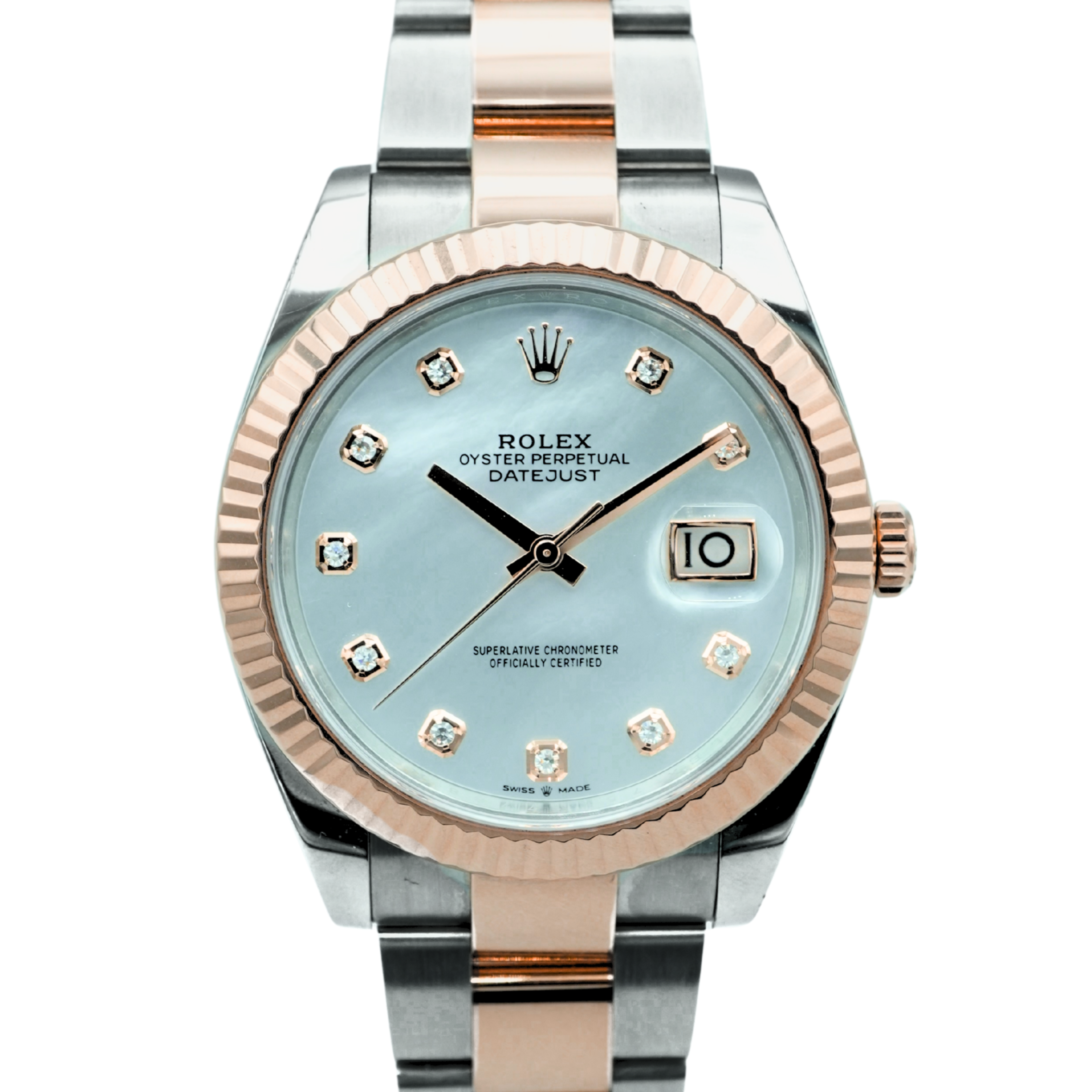 The 2016 Rolex Datejust 41 mm ref. 126331 features a mother-of-pearl dial with factory-set diamonds, fluted 18K rose gold bezel, and a two-tone Oyster bracelet. This complete set is 100 % authentic and expert verified, includes the original Rolex box and papers, and ships with free insured shipping.