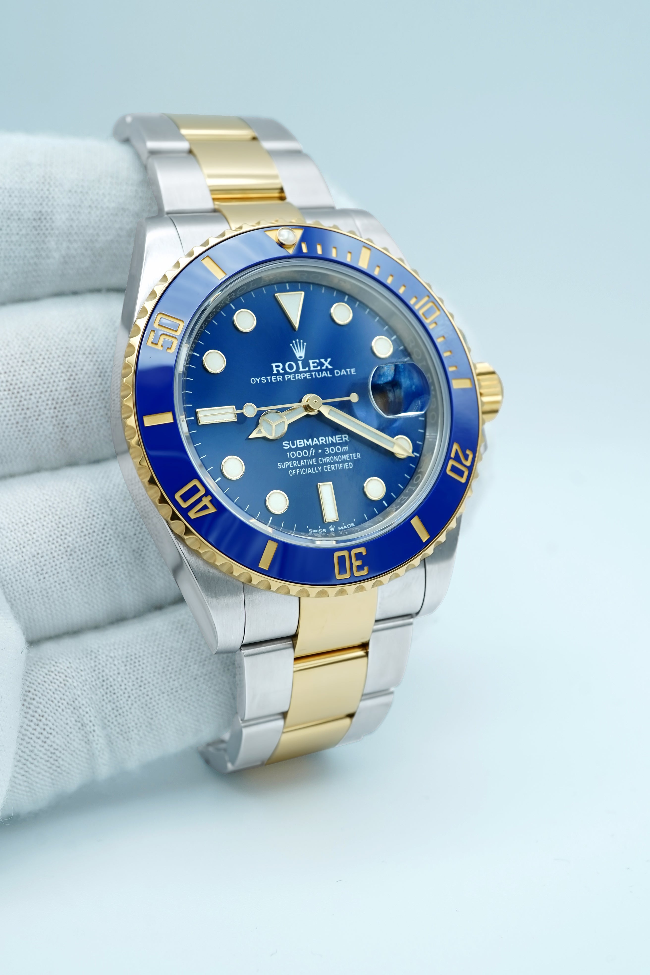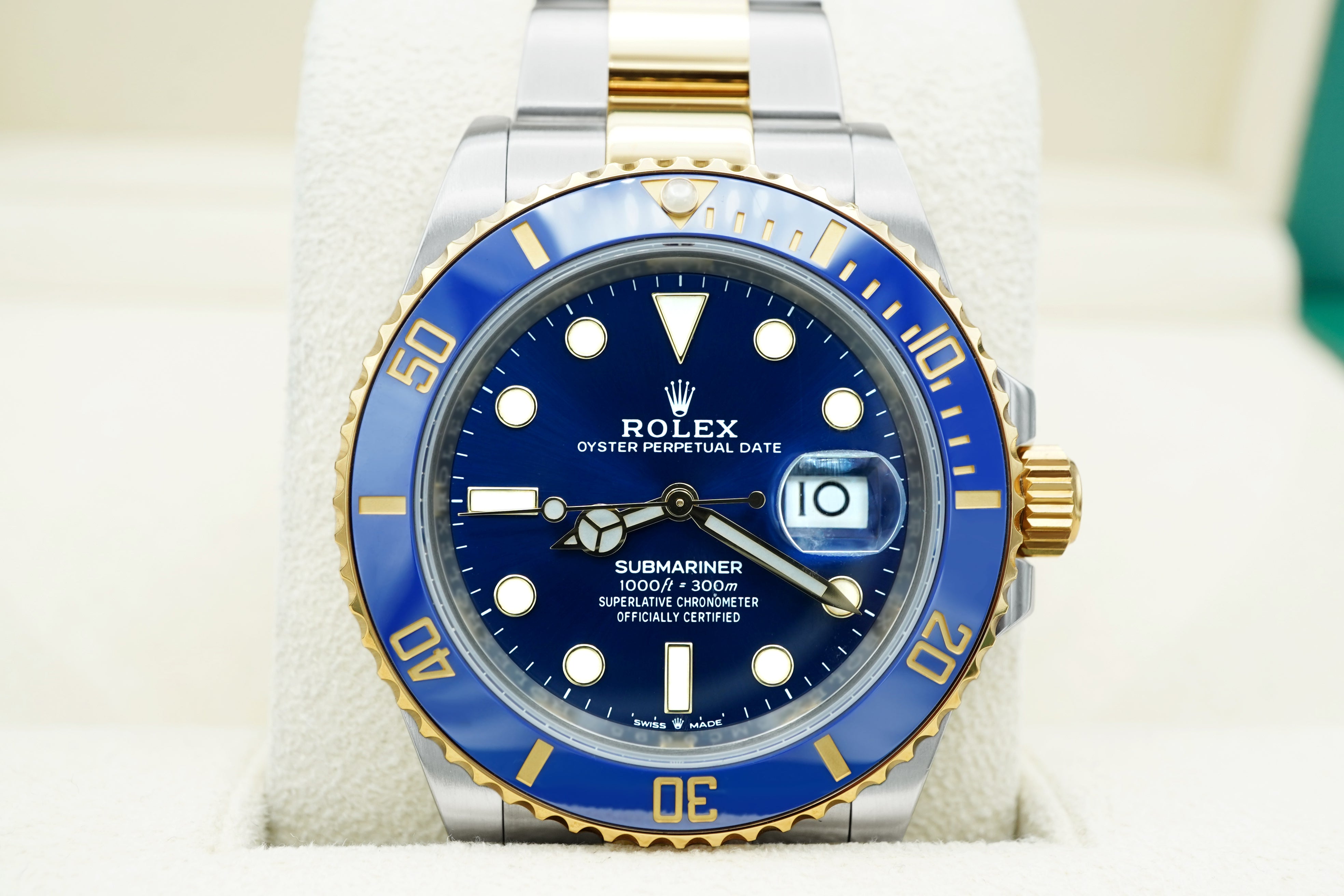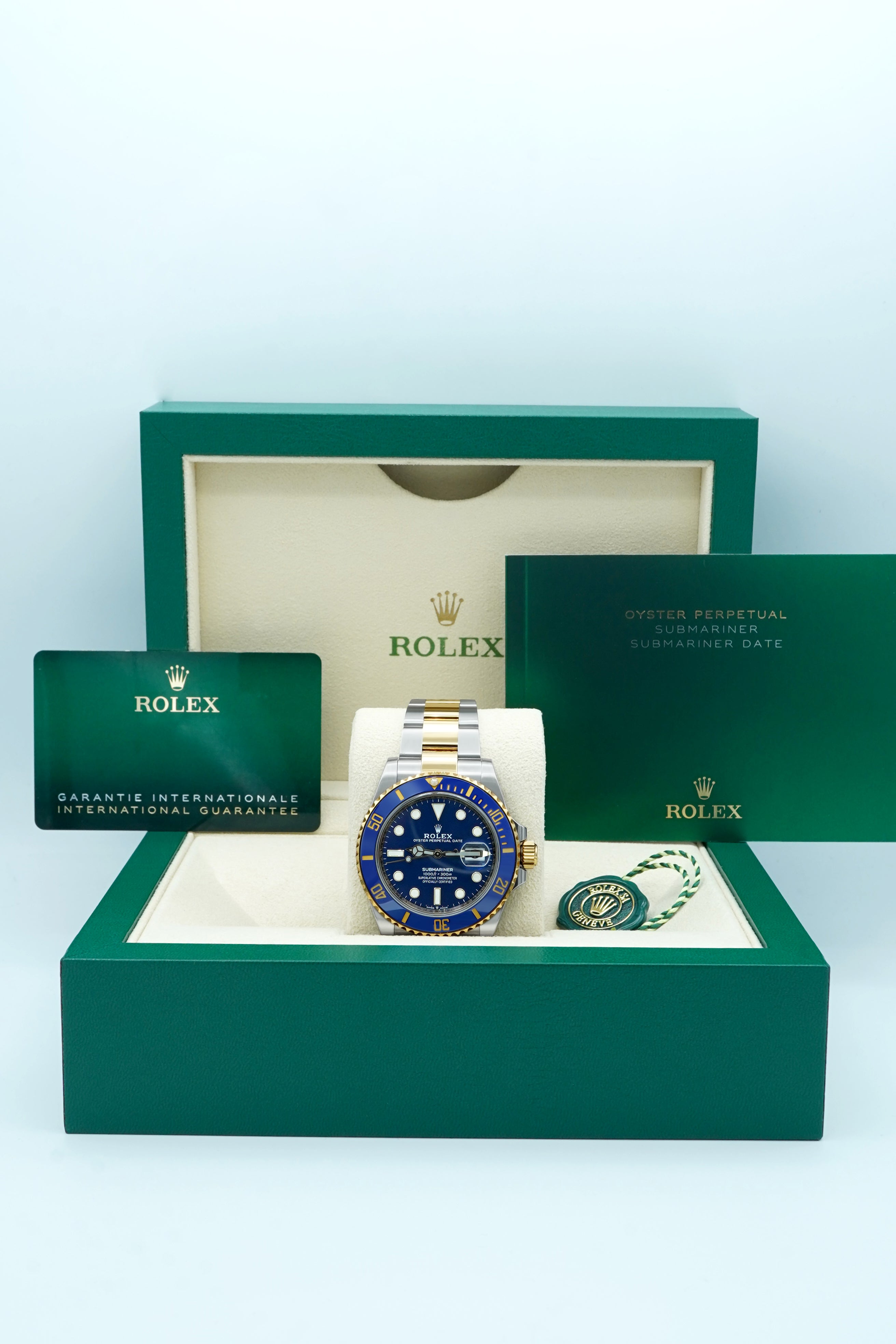 The Rolex Submariner Date 126613LB features a stainless steel and 18K yellow gold case, blue ceramic bezel, blue dial, and an Oyster bracelet. This complete 2021 set includes the original Rolex box and papers.