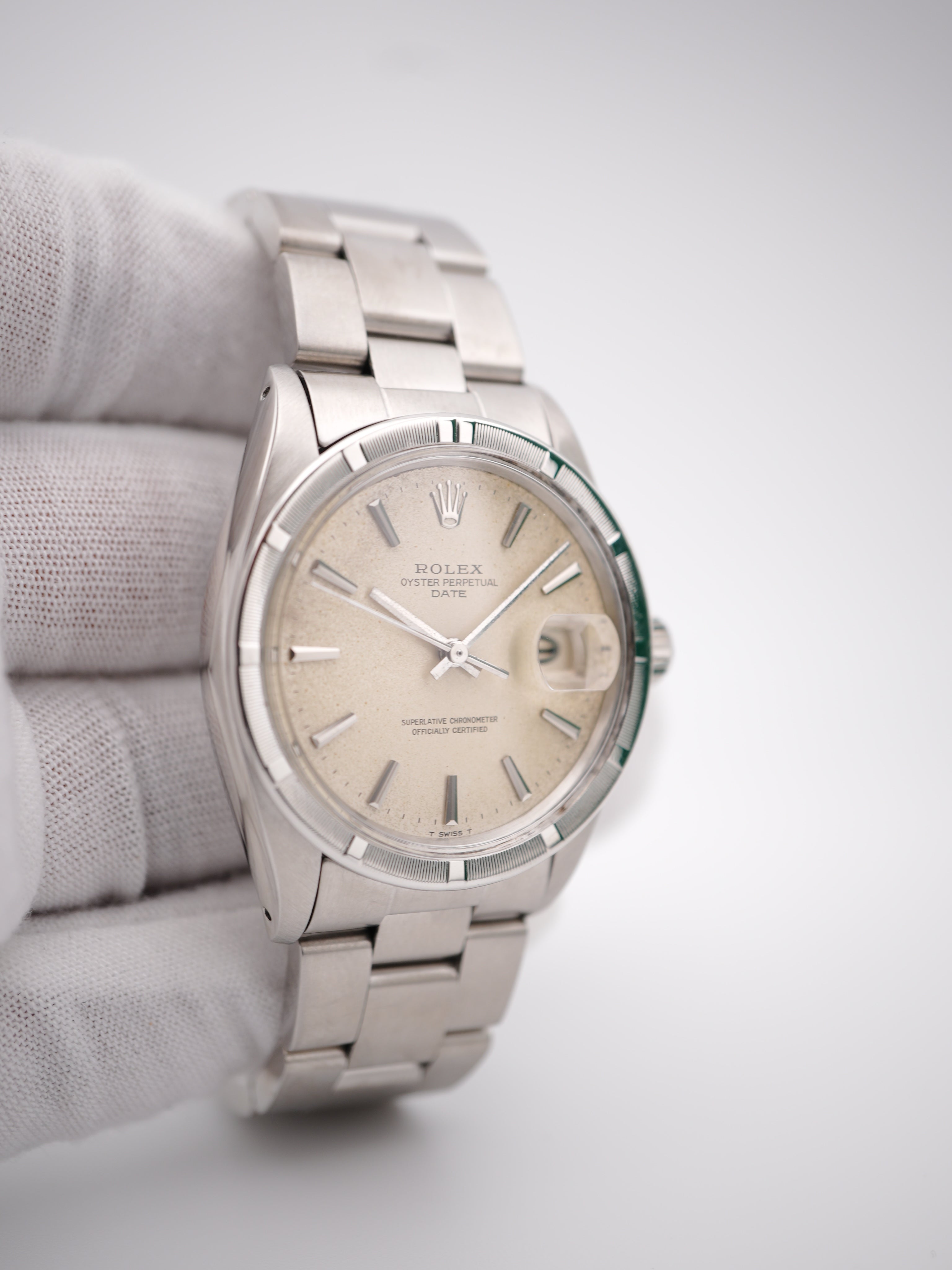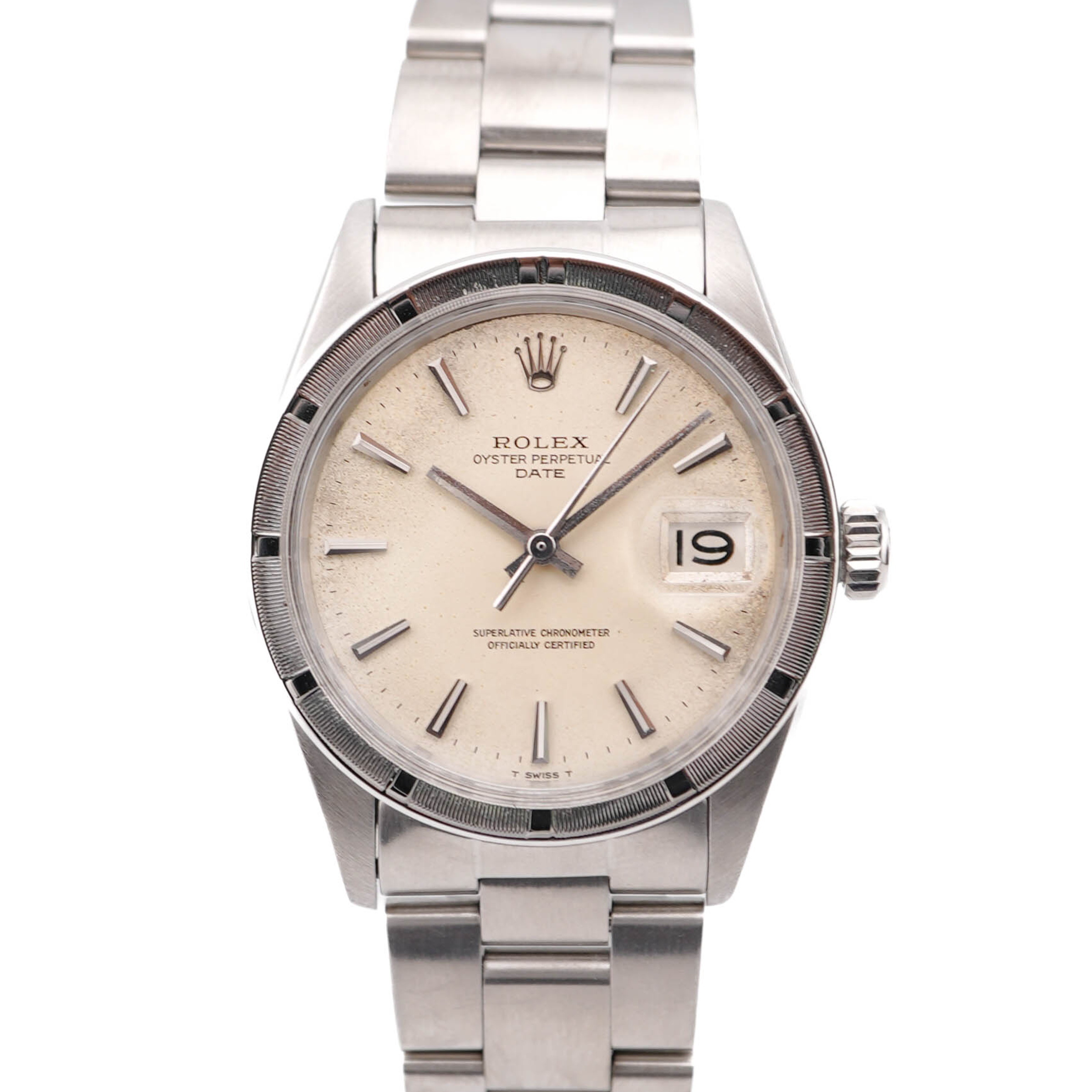 Rolex 1501 Oyster Perpetual Date 34mm Engine Turned Bezel Silver Index Dial Oyster Bracelet 1969