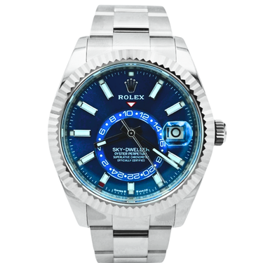 The 2024 Rolex Sky-Dweller 42 mm ref. 336934 features a vibrant blue dial with dual time zone and annual calendar functions, fluted 18K white gold bezel, and a stainless steel Oyster bracelet. This complete set is 100 % authentic and expert verified, includes the original Rolex box and papers, and ships with free insured shipping.