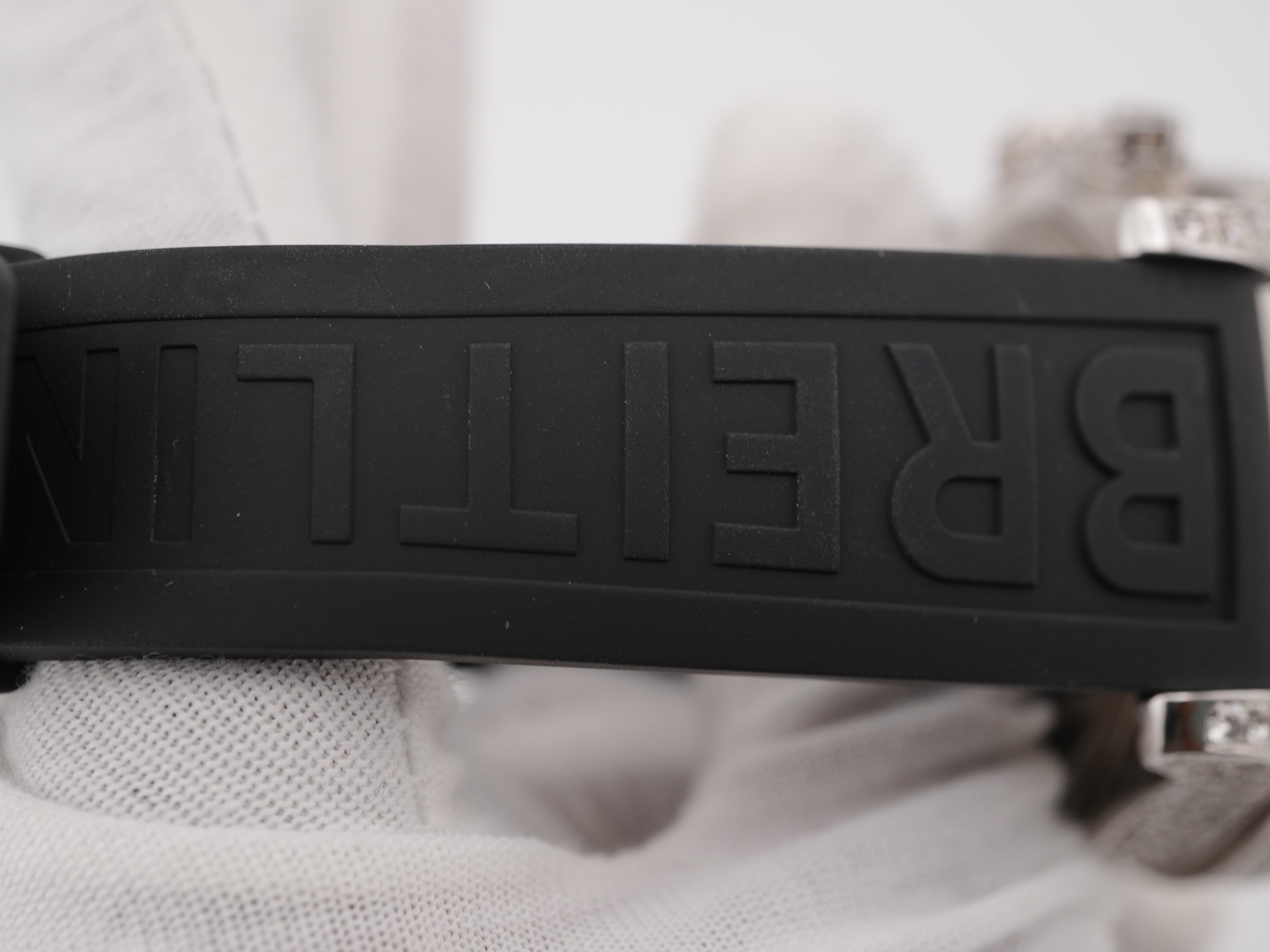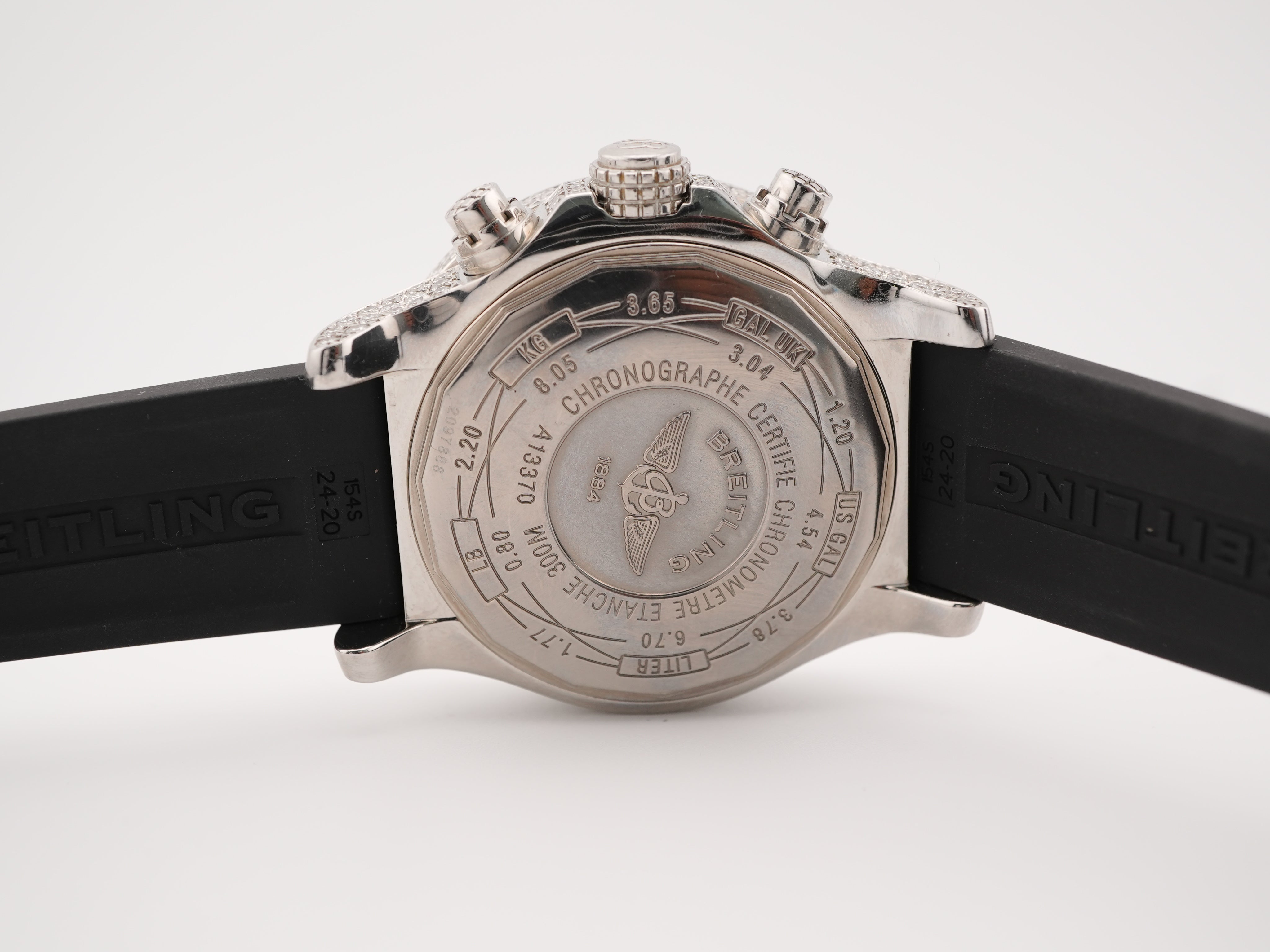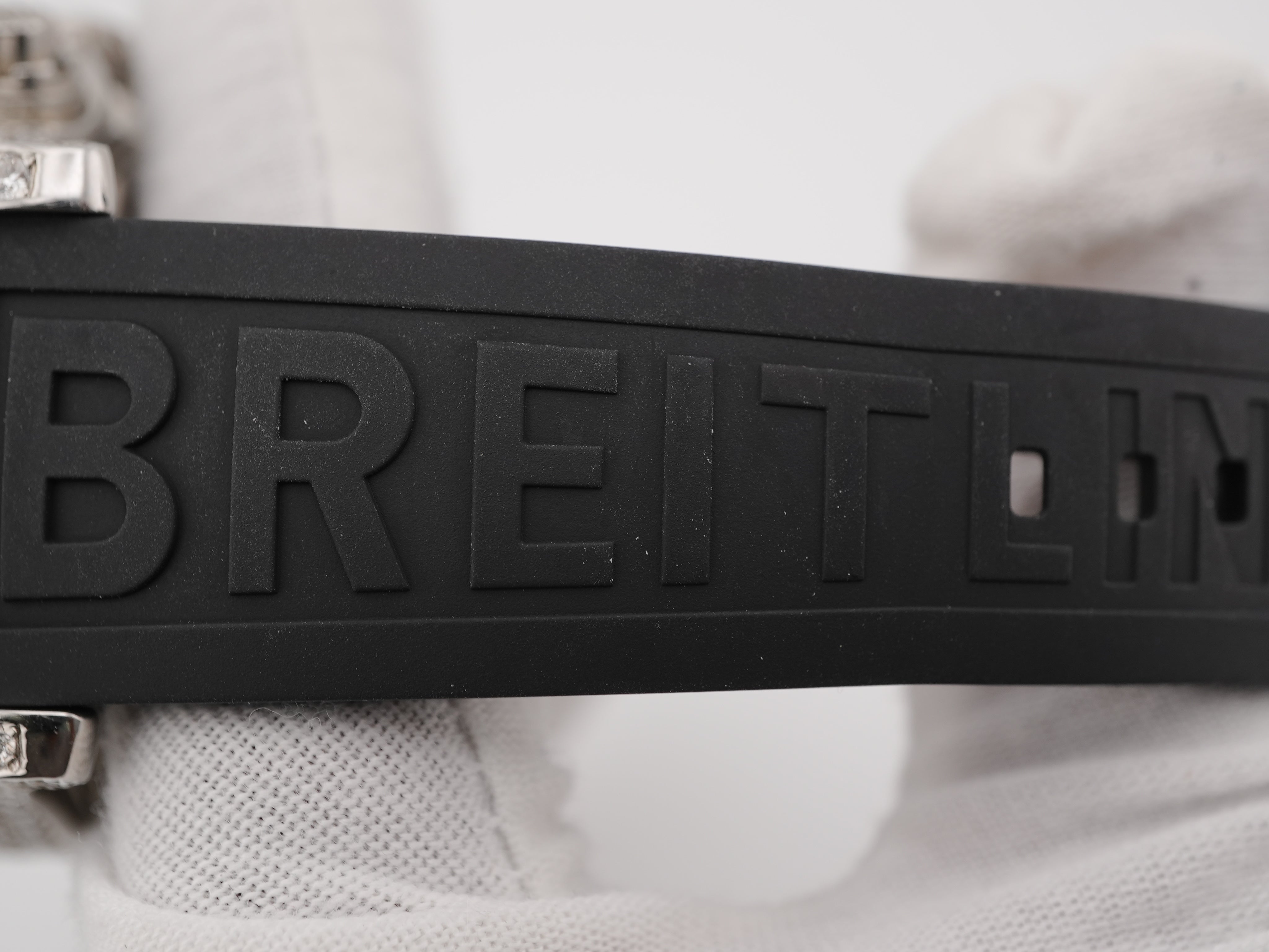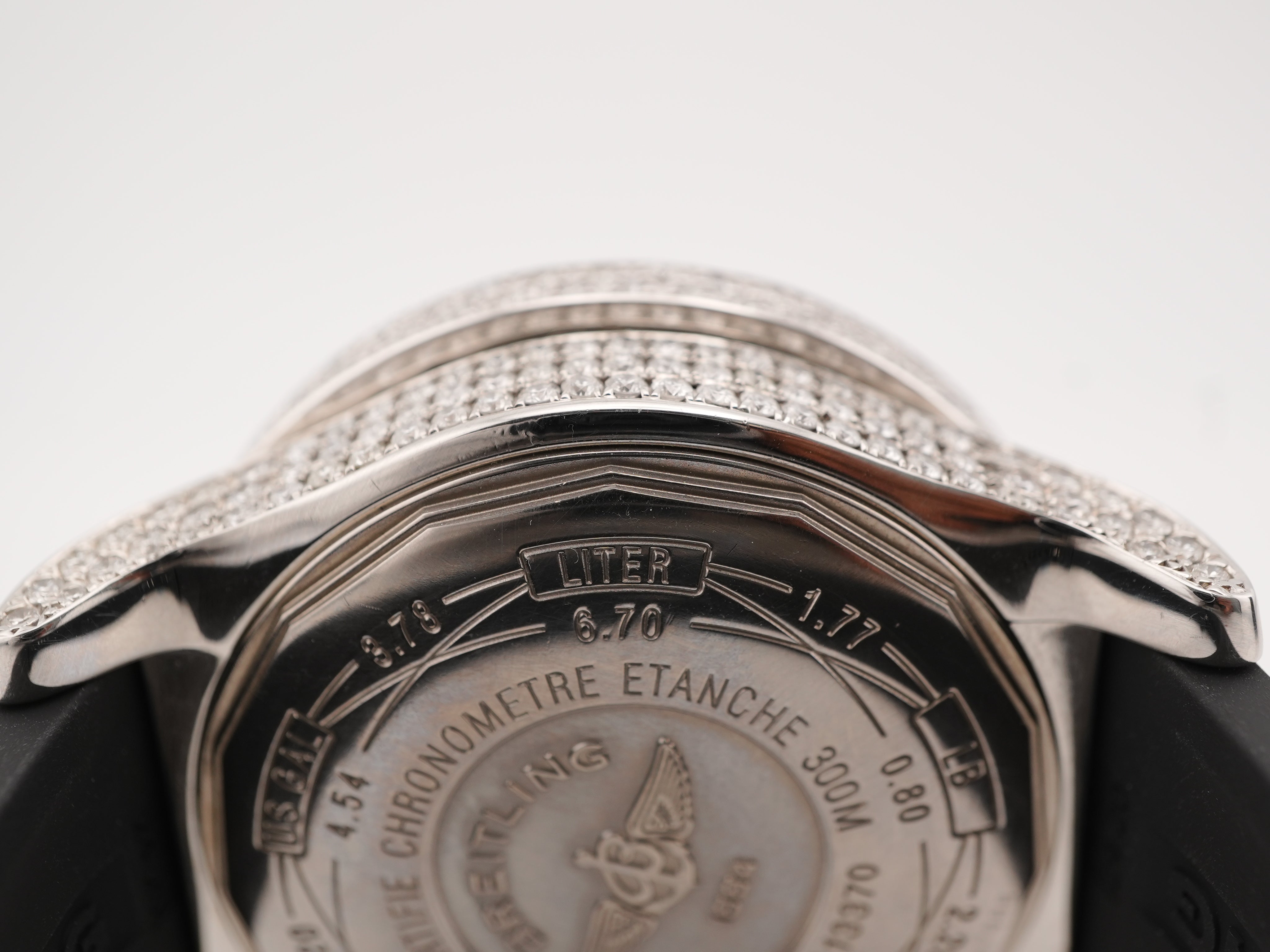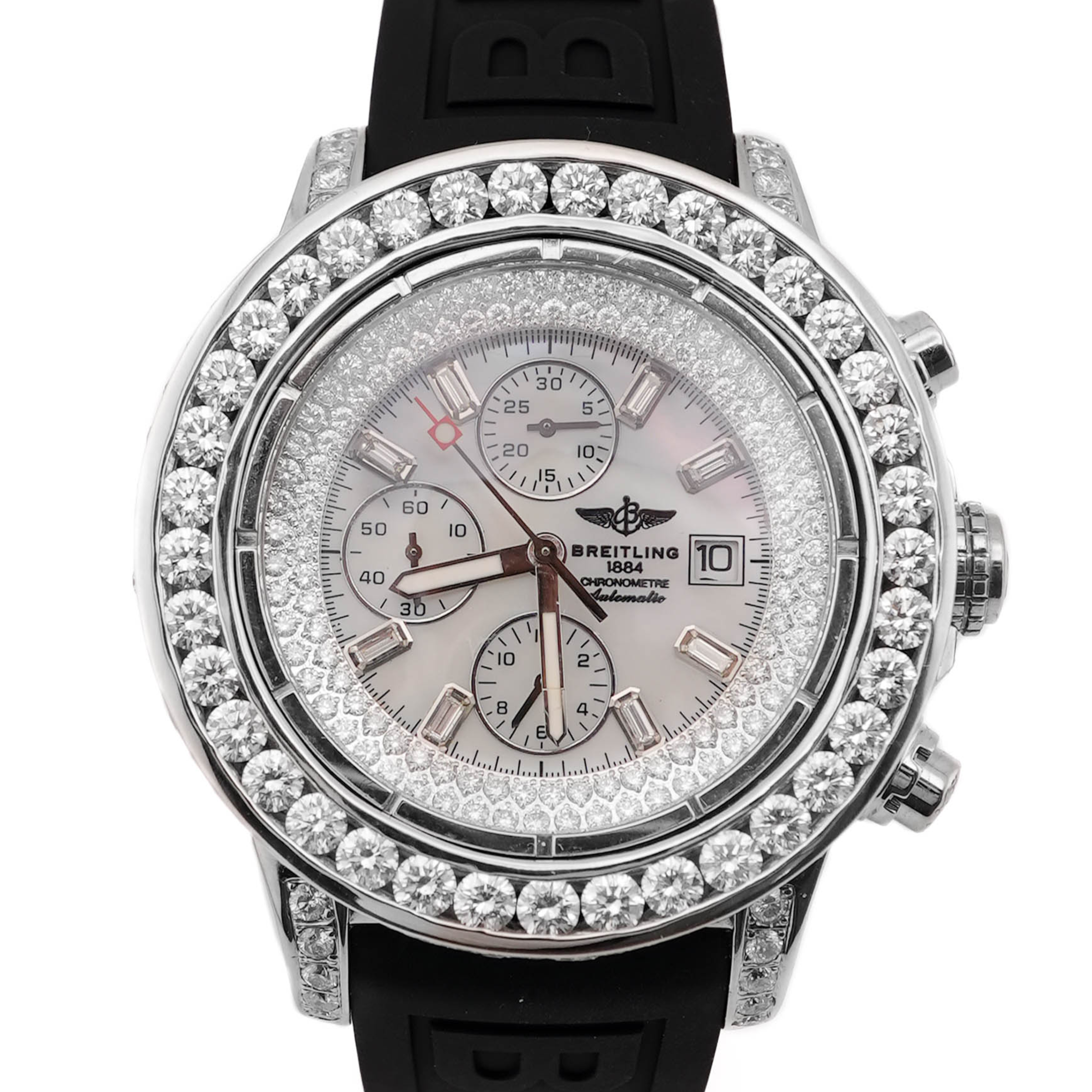 The Breitling Super Avenger Chronograph features a 48mm stainless steel case, custom diamond bezel, white mother of pearl dial with diamond hour markers, chronograph functions, and a black rubber strap.