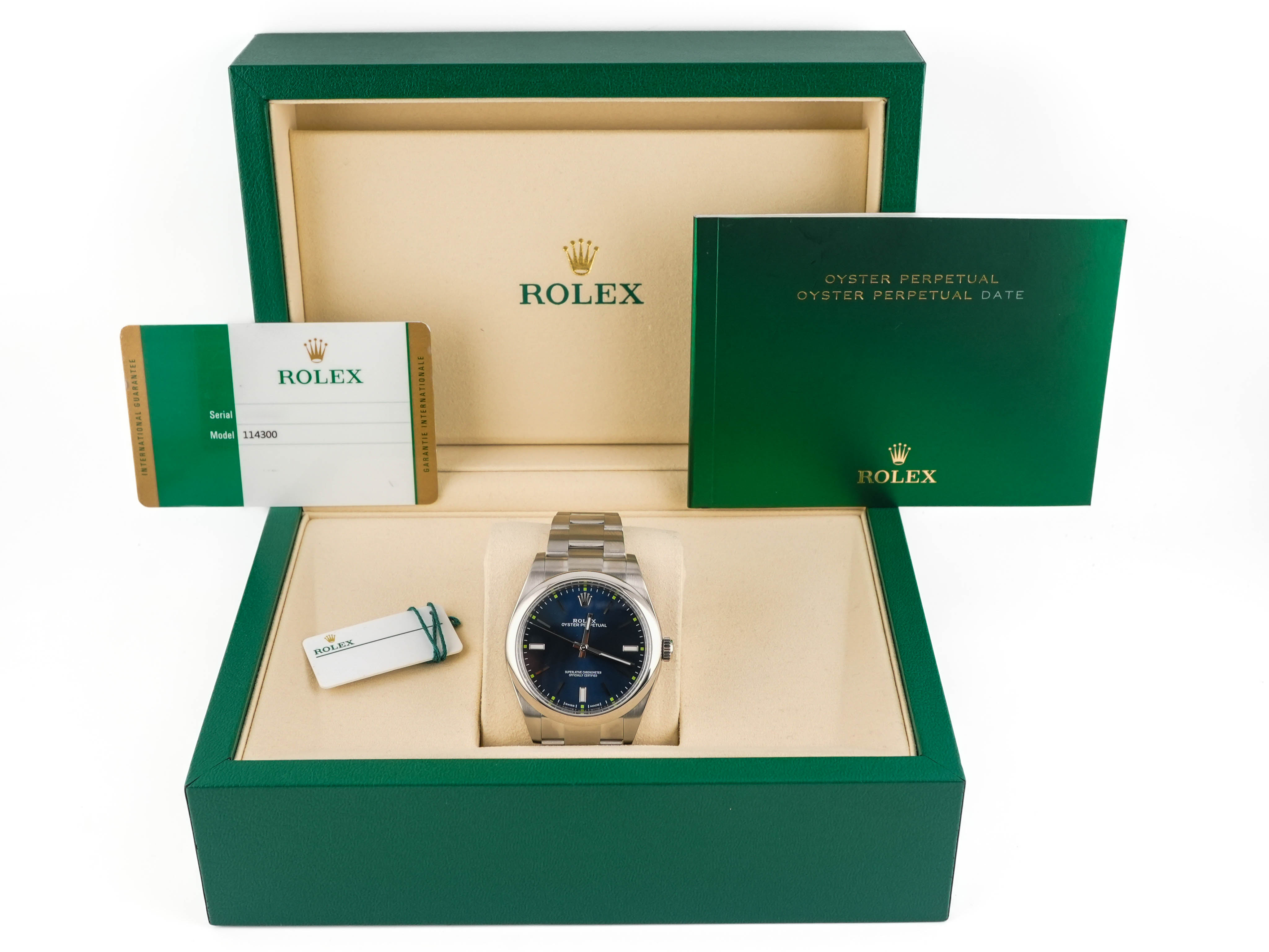Rolex 114300 Oyster Perpetual 39 mm Smooth Blue Dial Stainless Steel Box and Papers 2015