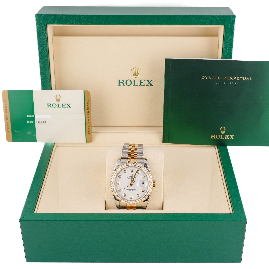 Rolex 116243 Datejust 36 mm Diamond Bezel White Diamond Dial Jubilee Bracelet Box and Papers 2015