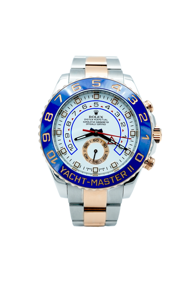 The 2016 Rolex Yacht-Master II 44 mm ref. 116681 features a white dial, blue ceramic bezel, and two-tone stainless steel and 18K Everose gold Oyster bracelet. Designed for regatta timing, this complete set is 100 % authentic and expert verified, includes the original Rolex box and papers, and ships with free insured shipping.