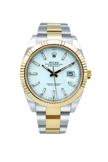 The 2017 Rolex Datejust 41 mm ref. 126333 features a clean white index dial, fluted 18K yellow gold bezel, and two-tone Oyster bracelet. This complete set is 100 % authentic and expert verified, includes the original Rolex box and ships with free insured shipping.