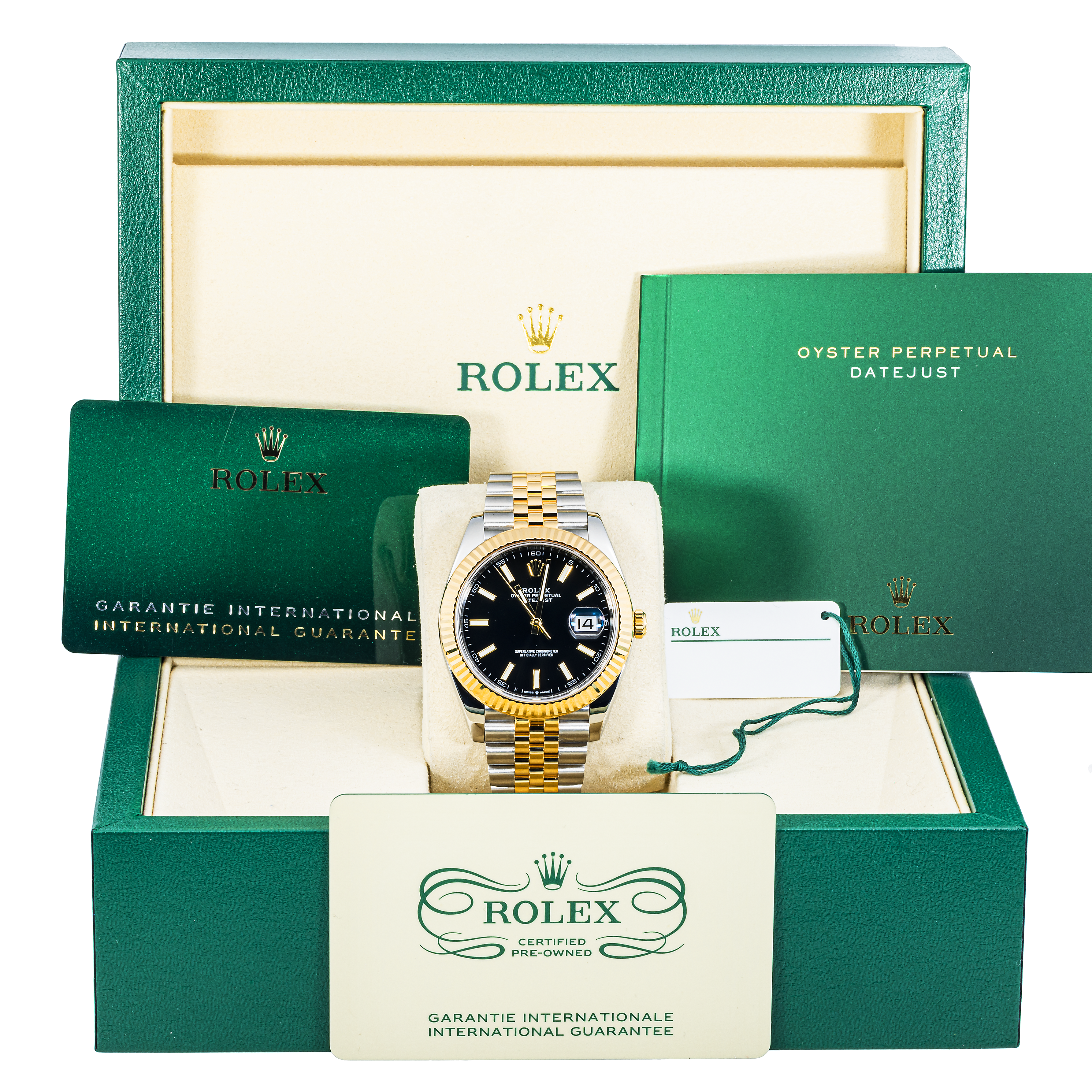 Accessories: Original Rolex Box, Original Rolex Warranty Card, Rolex Certified Pre-Owned Warranty Card & Original Rolex Datejust Manual.