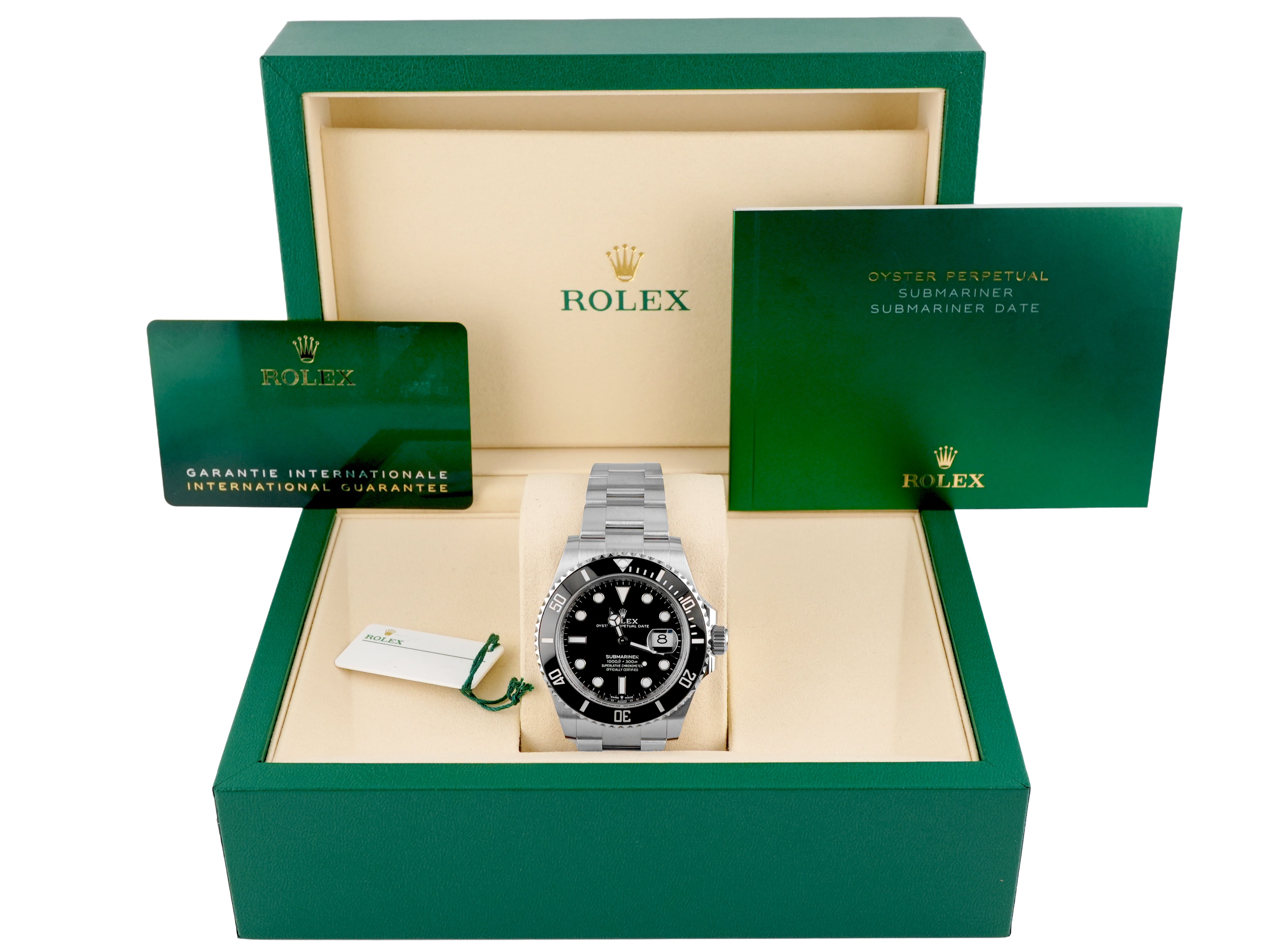 This Rolex Submariner Date comes complete with box and papers and is in excellent condition. It has been professionally serviced and shows no scratches. This pre-owned watch includes the original Rolex box, Submariner booklet, green tag, white tag, and warranty card dated 2025, as shown in the photos. It is in stock and ready to ship immediately with free, fully insured shipping.