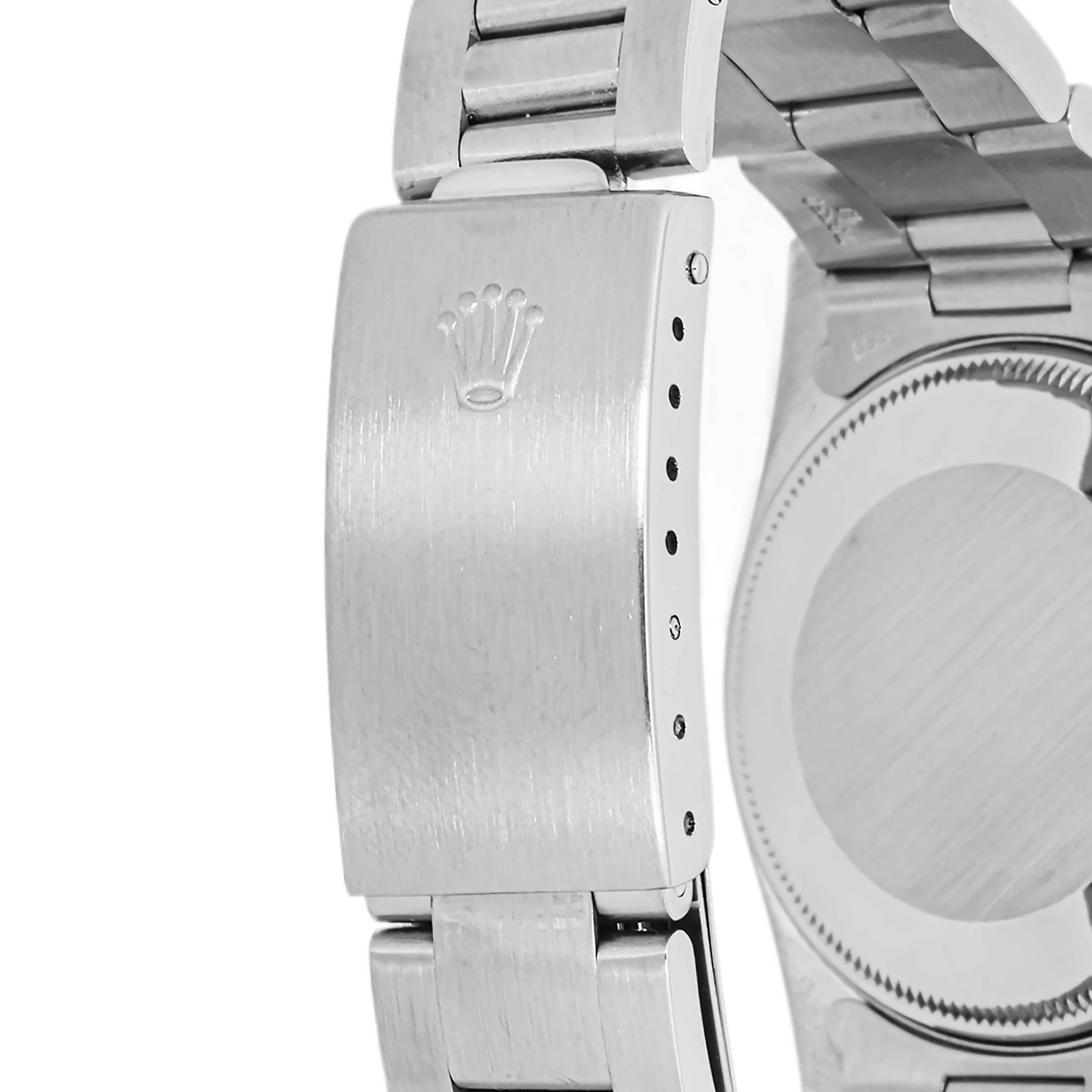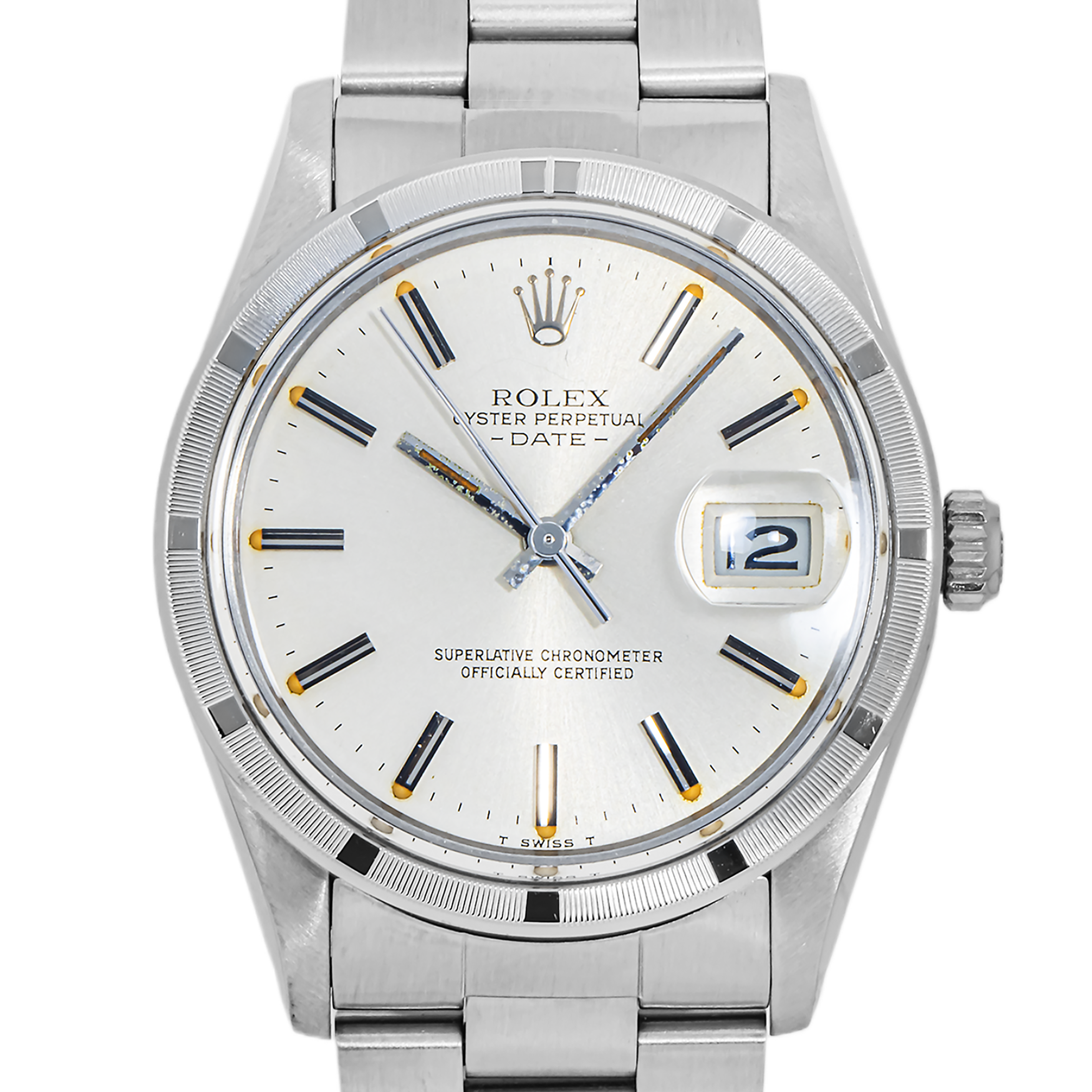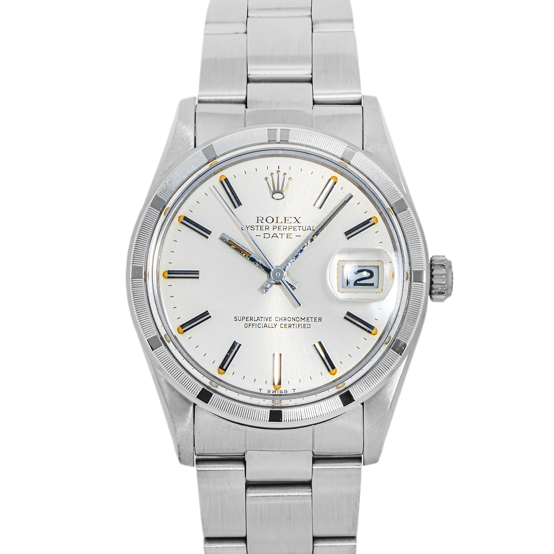 Rolex 15010 Oyster Perpetual Date 34 mm Engine Turned Bezel Silver Index Dial Oyster Bracelet 1982