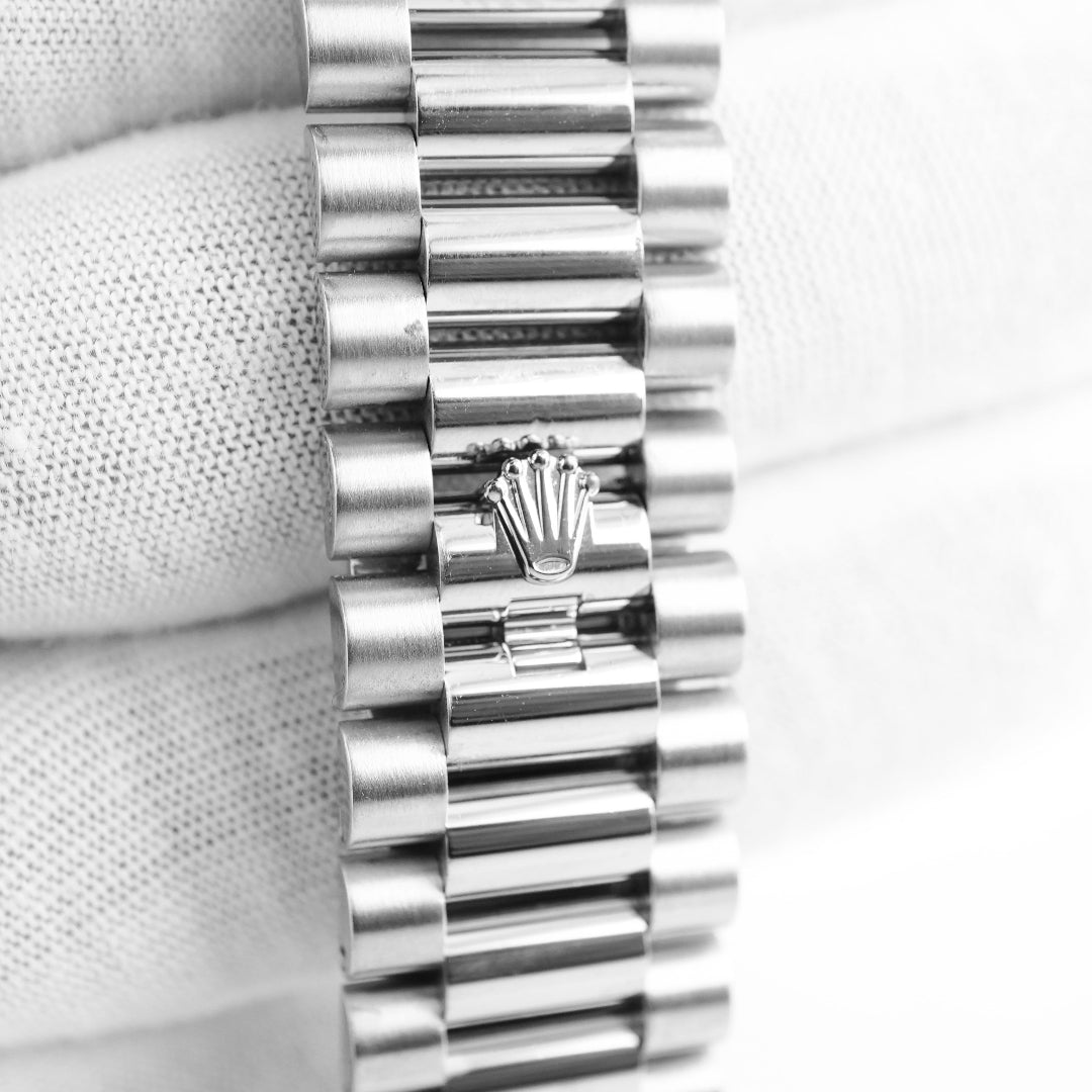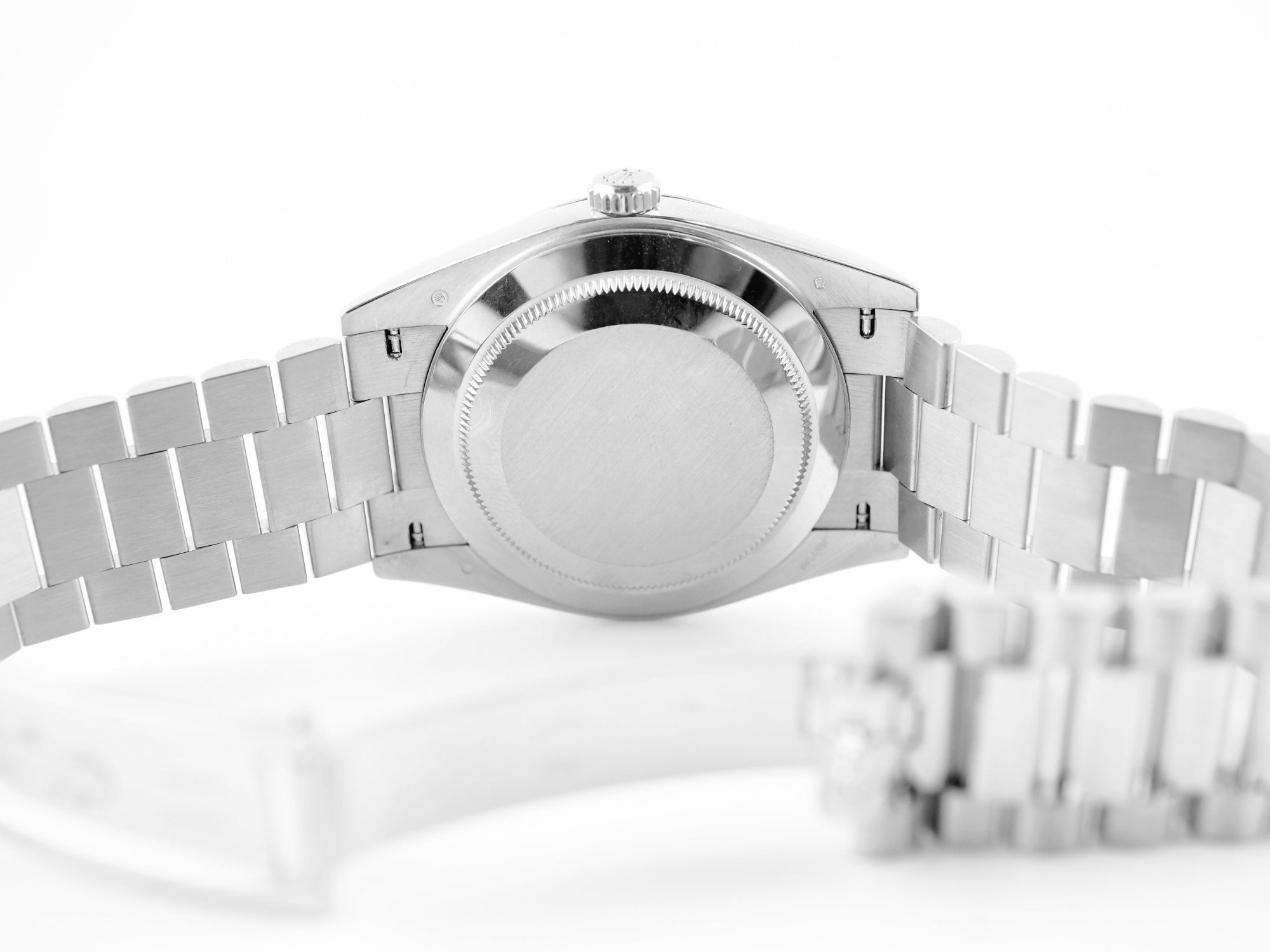 This pre-owned Rolex Day-Date 40mm in 18K white gold is in like-new condition and comes complete with box and papers as shown in the photos, including the original warranty card dated 2025. Professionally inspected and serviced by our certified watchmaker — all parts strictly factory original, zero aftermarket components. In stock and ready for immediate shipment with free, fully insured overnight shipping. Guaranteed 100% authentic, backed by our 2-year warranty — buy with complete confidence.