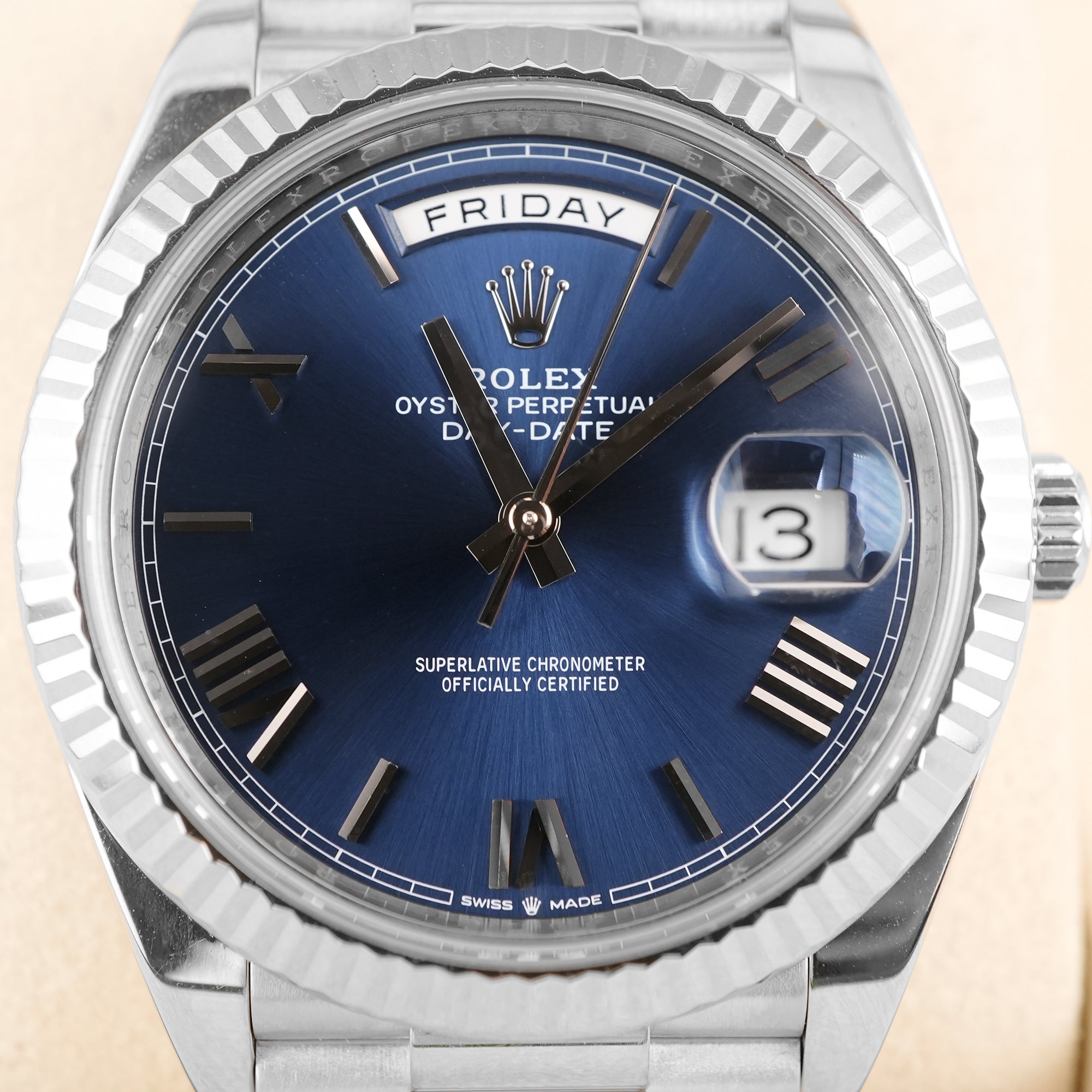 Rolex 228239 Day-Date 40 mm 18K White Gold Blue Bevelled Roman Dial Box and Papers 2025