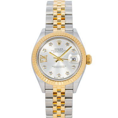 This Rolex Lady-Datejust 28 comes complete with box and papers and is in very good condition, as shown in the photos. This pre-owned watch has been professionally serviced and polished. All parts are factory original and authenticated, with no aftermarket parts. This watch features a factory Rolex silver diamond star dial with factory diamonds. The watch includes the original Rolex box, Datejust manual, and warranty card dated 2019, as shown in the photos. It is in stock and ready to ship immediately with free, fully insured shipping. All watches are guaranteed 100% authentic, giving you complete trust and confidence with your purchase.