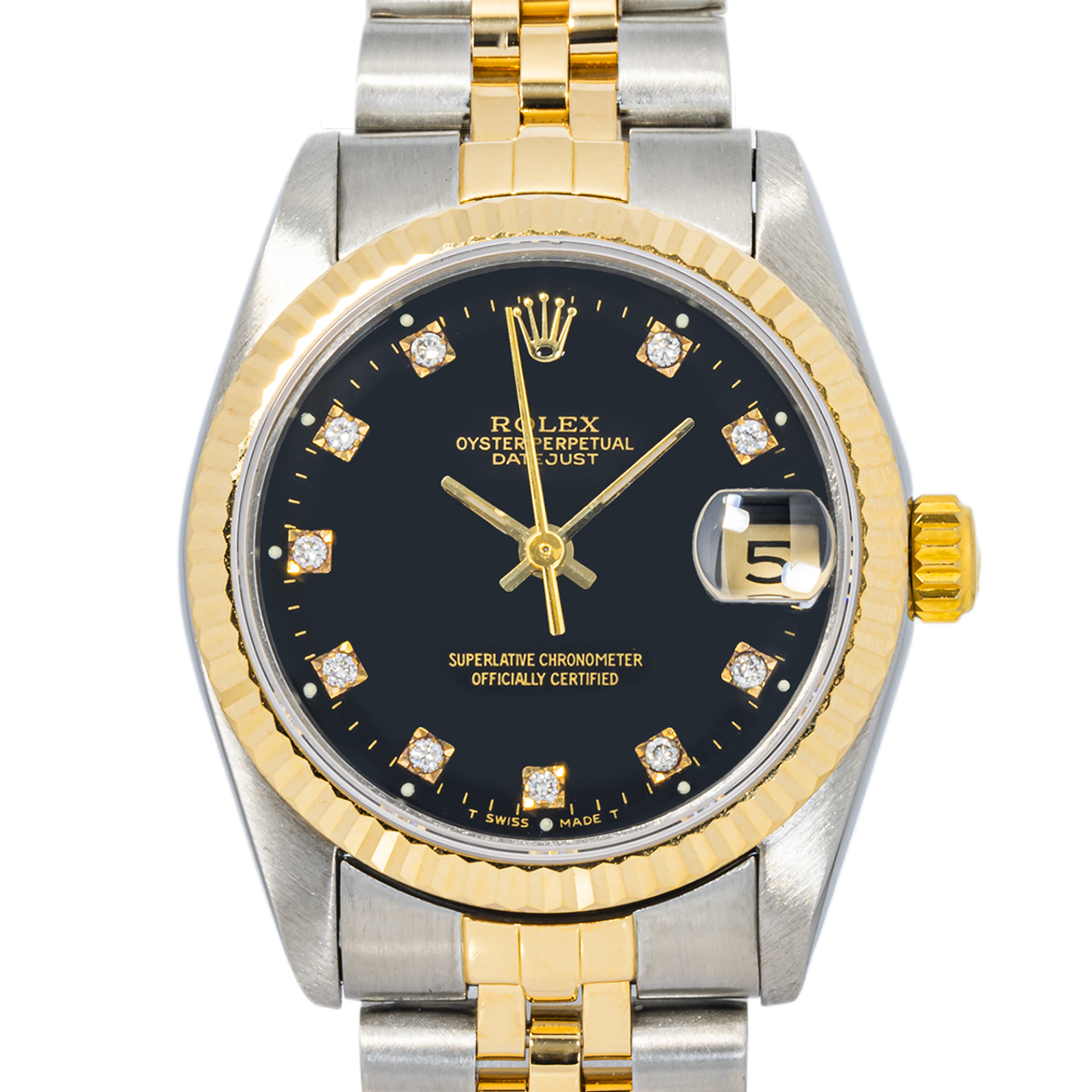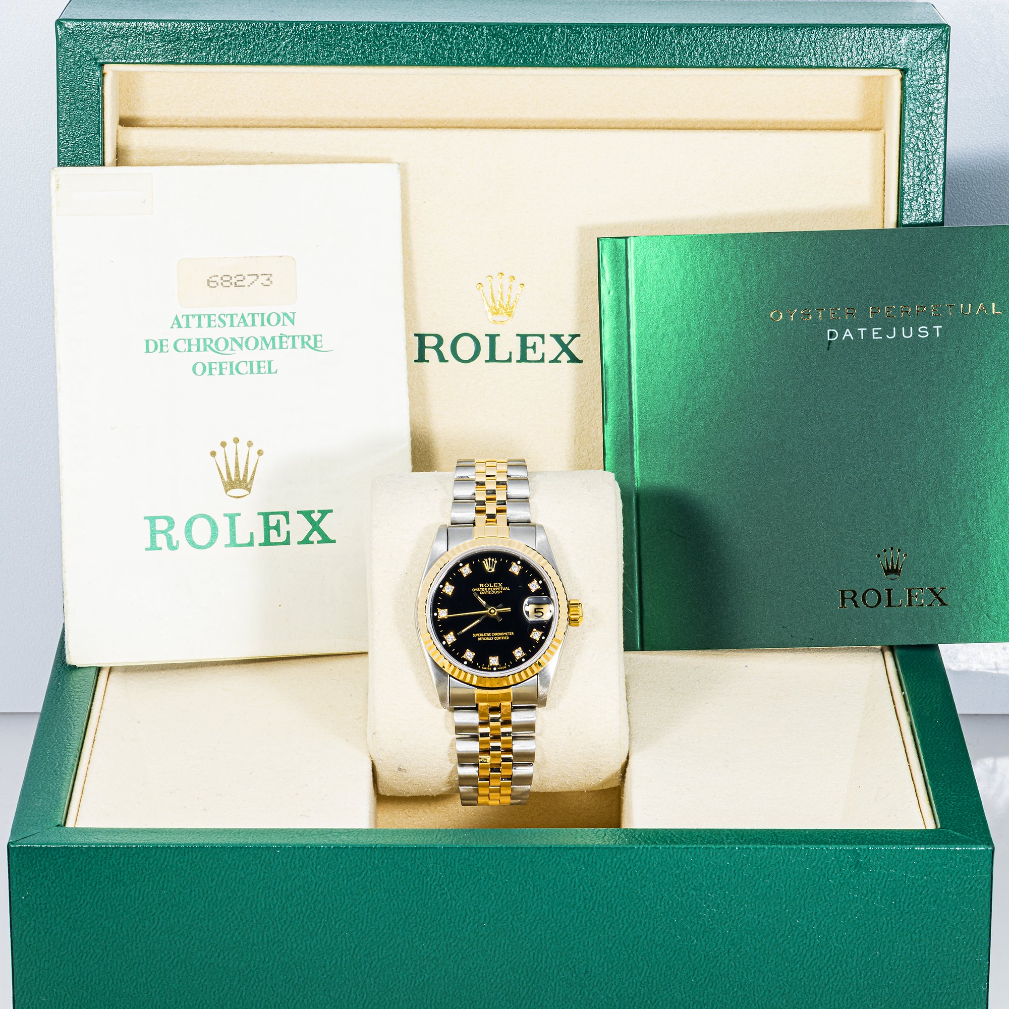 Rolex 68273 Datejust 31 mm Fluted Bezel Black Diamond Dial Jubilee Bracelet Box and Papers 1990