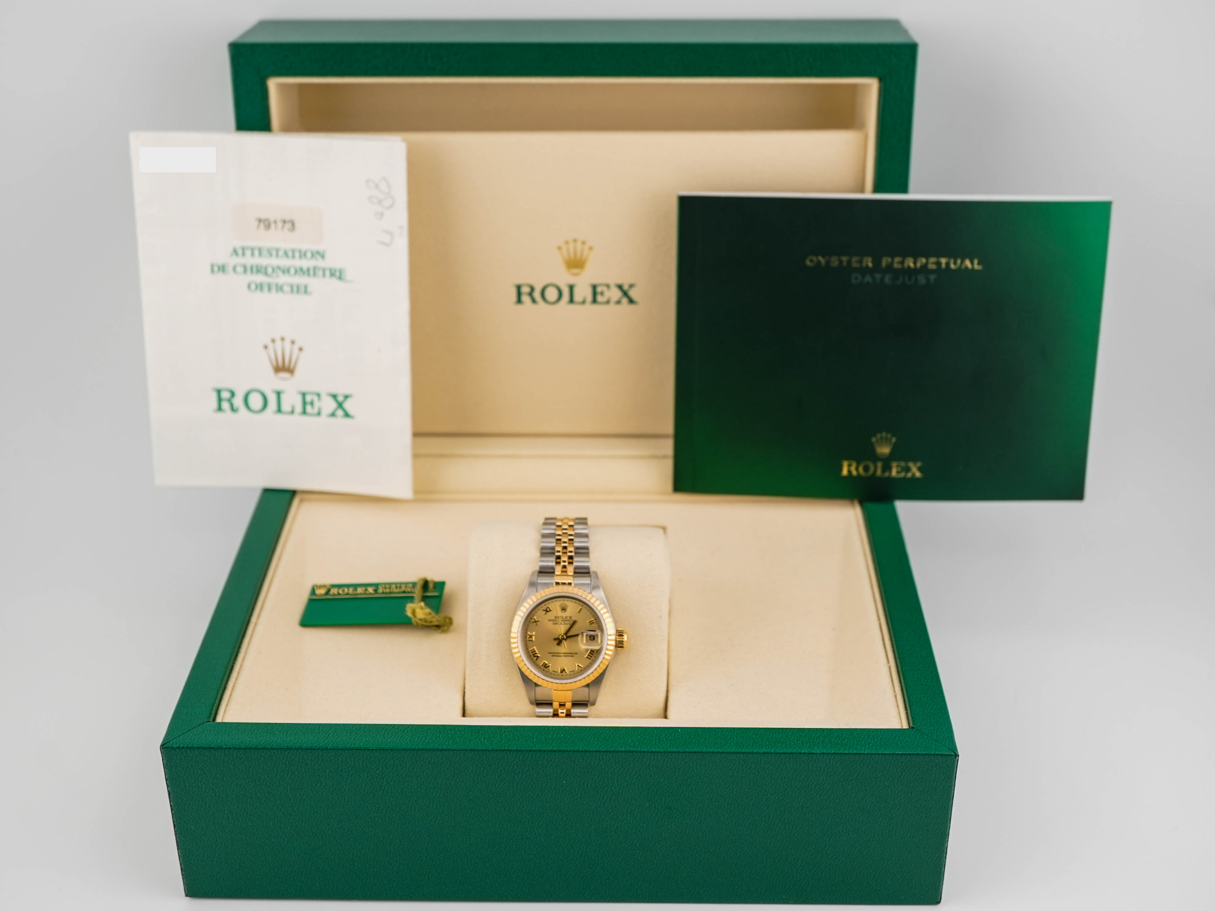 Rolex 79173 Lady-Datejust 26 mm Champagne Roman Dial Jubilee Bracelet Box and Papers 1999